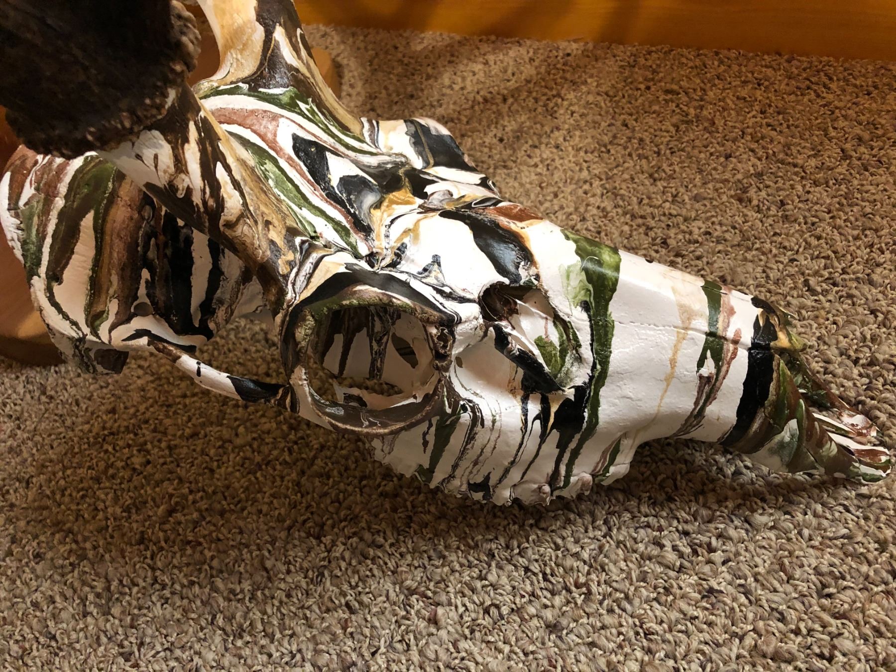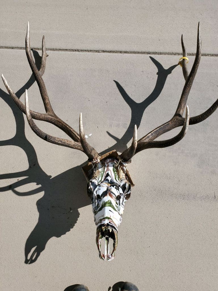 Description: Hand Painted Elk Skull. The art of acrylic pour began in the 1930's. Acrylic pouring is a technique where acrylic paint and a pour medium are used in combination to allow the paint to flow over a canvas or any 3-D object. On this Elk Mount, I used gold and Copper along with neutral colors to create this poured effect. I am honored to provide this service on this Elk Mount for the betterment of Wyoming's Wild Sheep. Thank You Wyoming Wild Sheep Foundation for the opportunity to work with you on this project. Amy D. Reed, Perfectly Imperfect 307