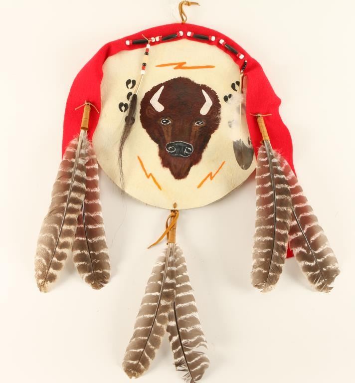 Depicting buffalo and lightning with feather, bead, hair and leather accents. "To Crazy Long Hair, Two Feather '03" on back. Shield measures 12"x12".