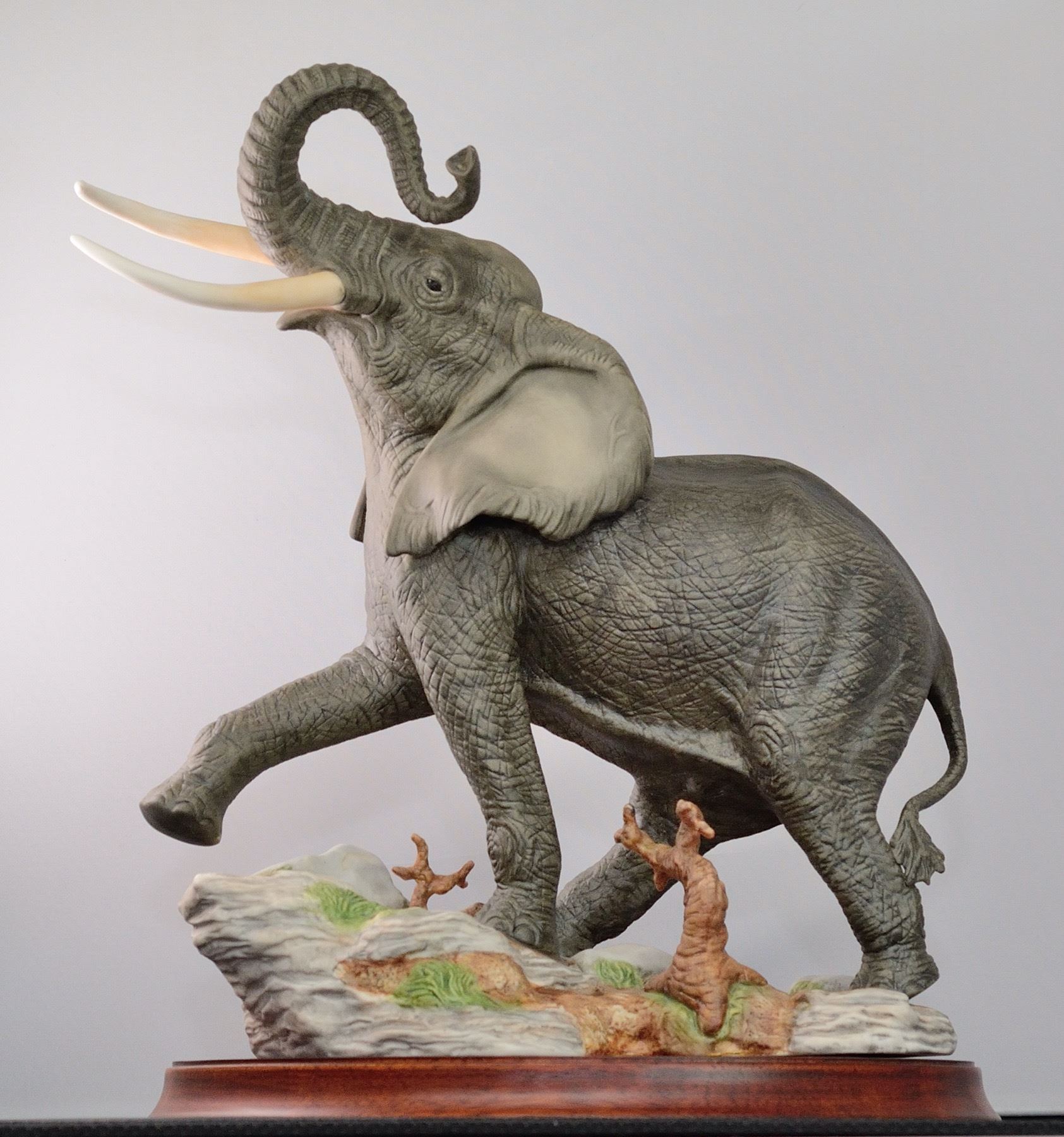 This fine sculpture is an official issue of the African Wildlife Foundation and was created by the Franklin Mint. The title for this piece is "Ruler of the African Plains" and it show the power and the majesty of the elephant. It is 11"L x 11.5"H x 7"W and comes with an elegant wood base. Buyer pays actual shipping costs.