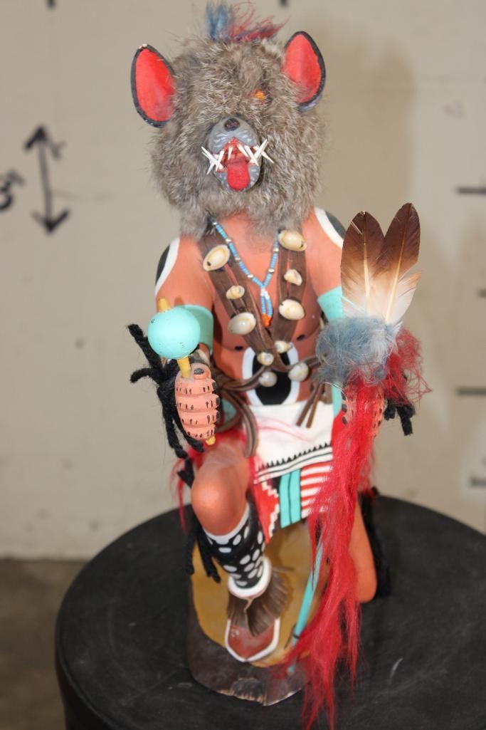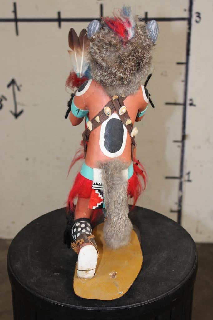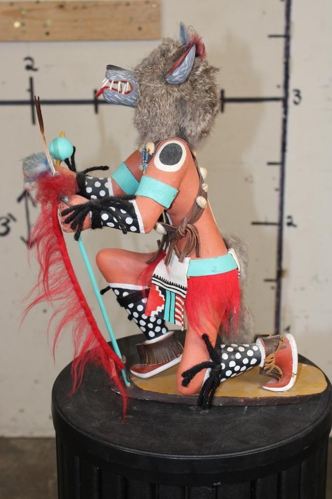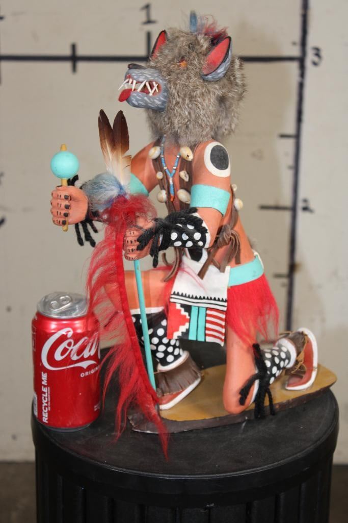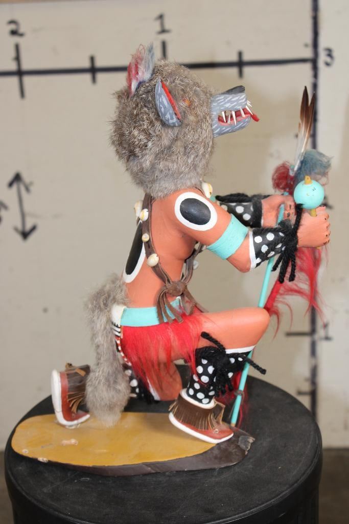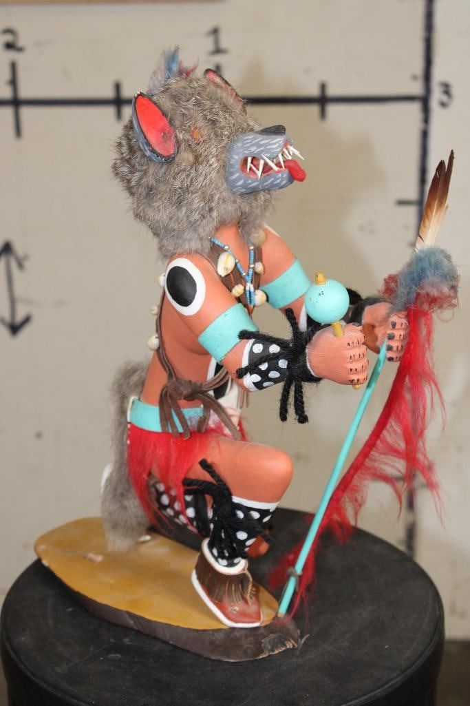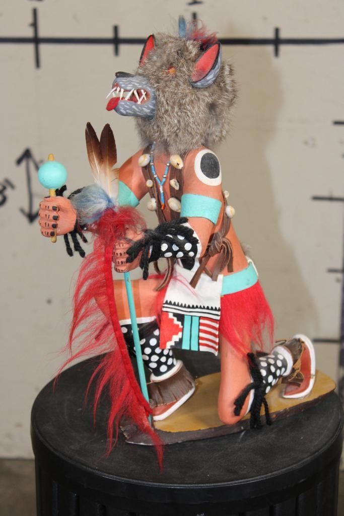 Hand-carved and Hand-painted Native American WOLF KACHINA Doll on a Wood Base. It measures 12.5" Long x 6" Wide x 15" Tall. Kachina Dolls are carved representations of spiritual beings central to the Hopi and other Pueblo cultures of the Southwestern United States. COLLECTIBLE NATIVE AMERICAN ART DOLLS