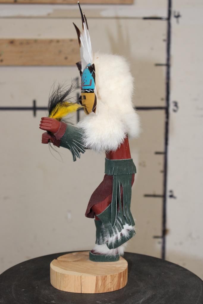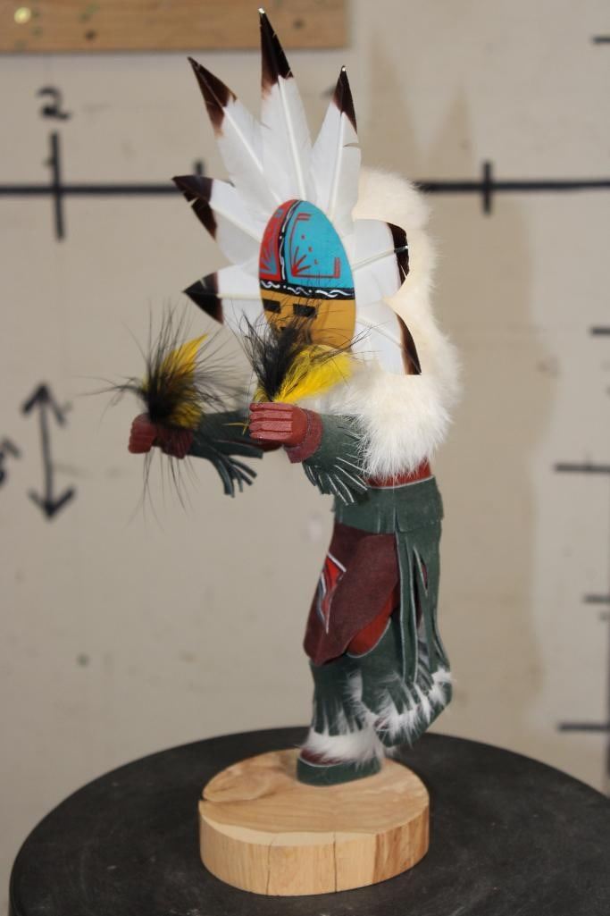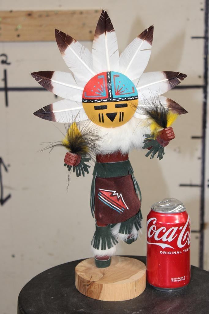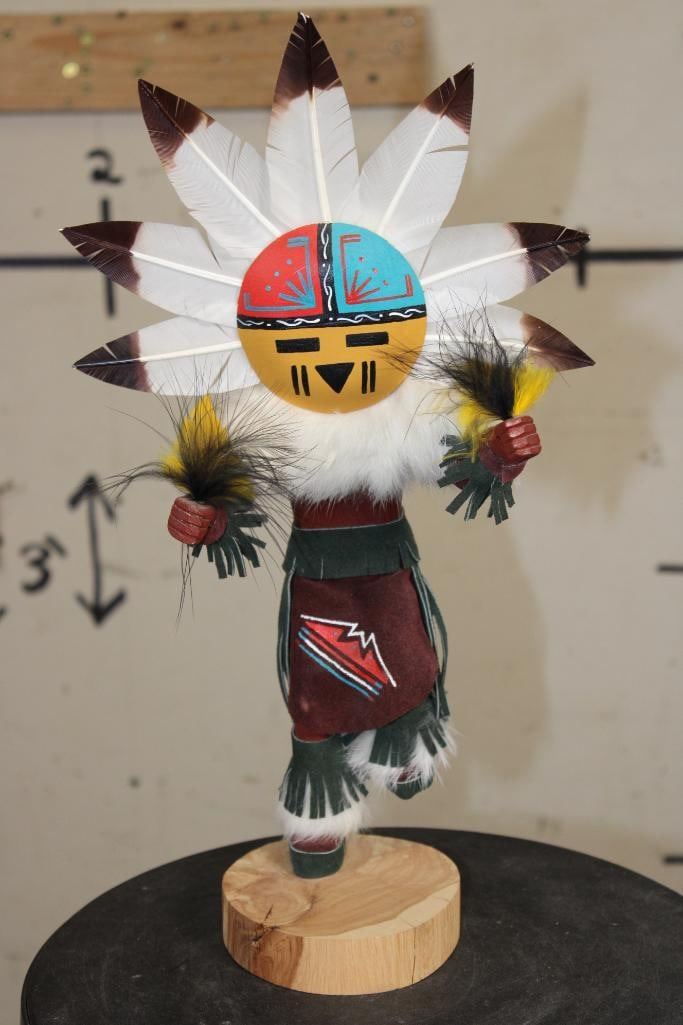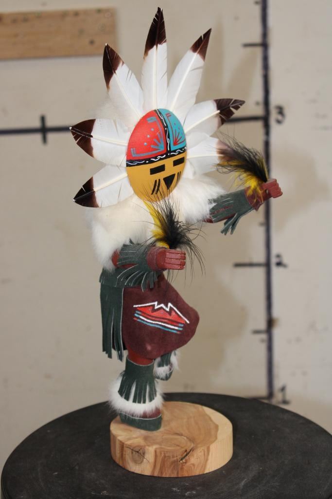 Hand-carved and Hand-painted "Sunface" Navajo KACHINA DOLL by artist P.J. Chupo. It measures 16" Tall x 9" Wide (at the feathers) x 5" (at Base). The Sunface Kachina, also known as Tawa, represents the spirit of the sun in Navajo and Hopi traditions. COLLECTIBLE NATIVE AMERICAN ART DOLLS