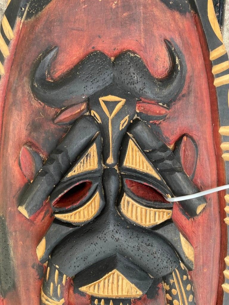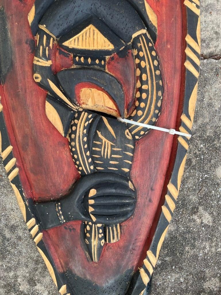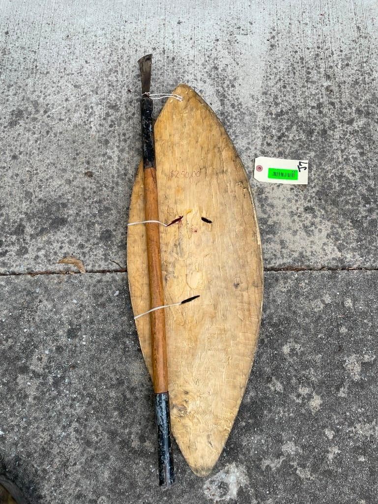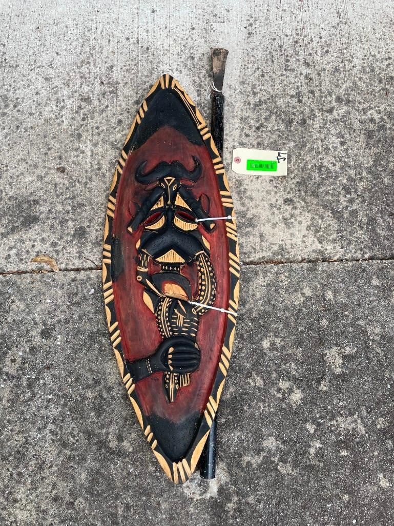 Hand-carved and Painted AFRICAN War Shield with a Weapon. The Shield measures 32" Long x 12" Wide. The Weapon is a square shaped blade on the end of a wood stick handle. It measures 35.5" Long. This is an awesome piece of Africa. It can be displayed on the wall and will make excellent Safari Decoration. COLLECTIBLE AFRICAN ARTIFACTS AND WEAPONS