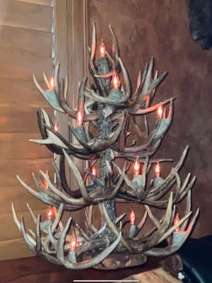 Each antler is carefully selected and arranged by hand, forming an intricate branching structure illuminated with warm, glowing lights that enhance its sculptural presence.