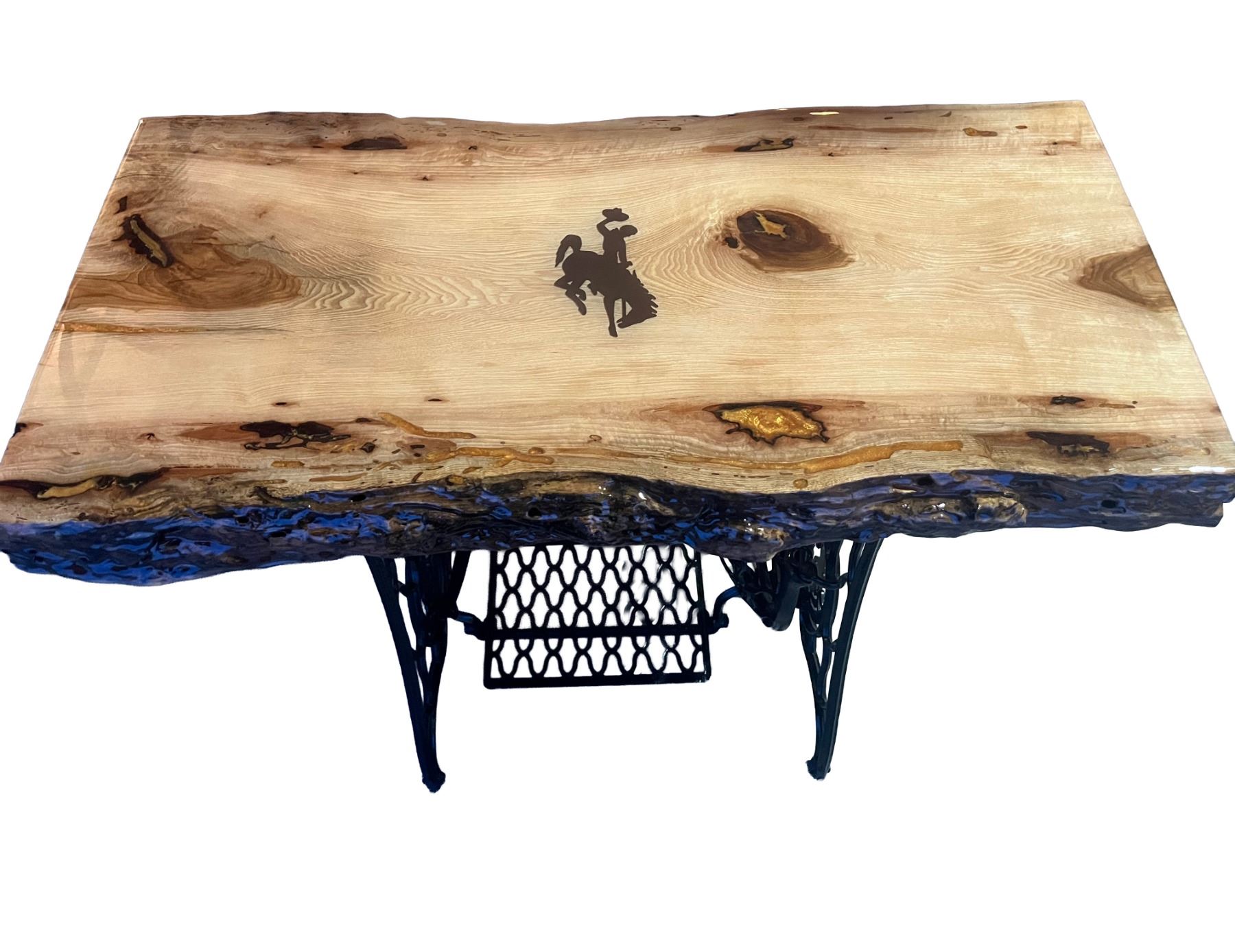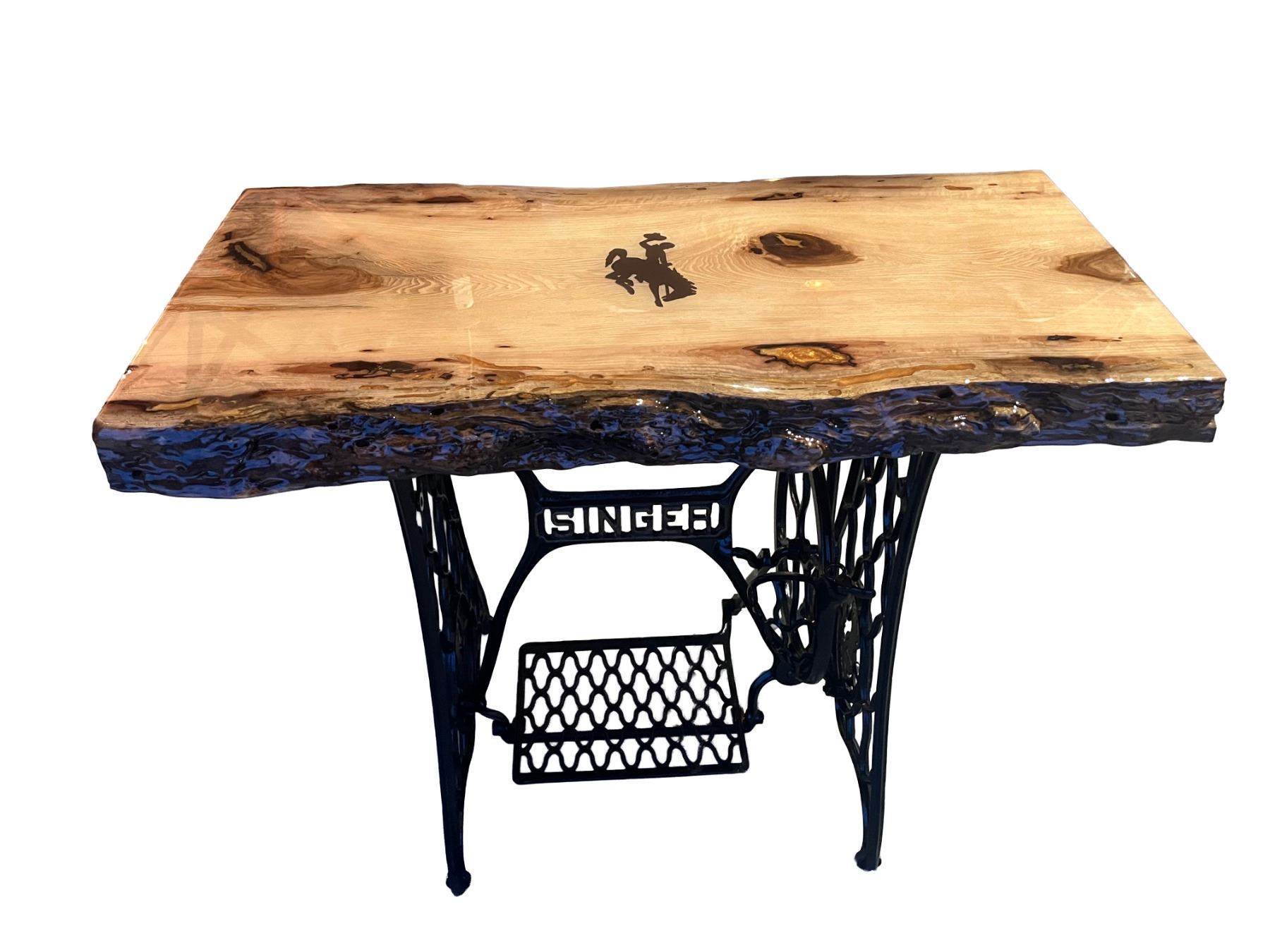 Description: Coffee Table made out of Hackberry wood top and a singer sewing machine base. Has Wyoming bucking horse. Hand Made by Life Member,Daryl Tiltrum