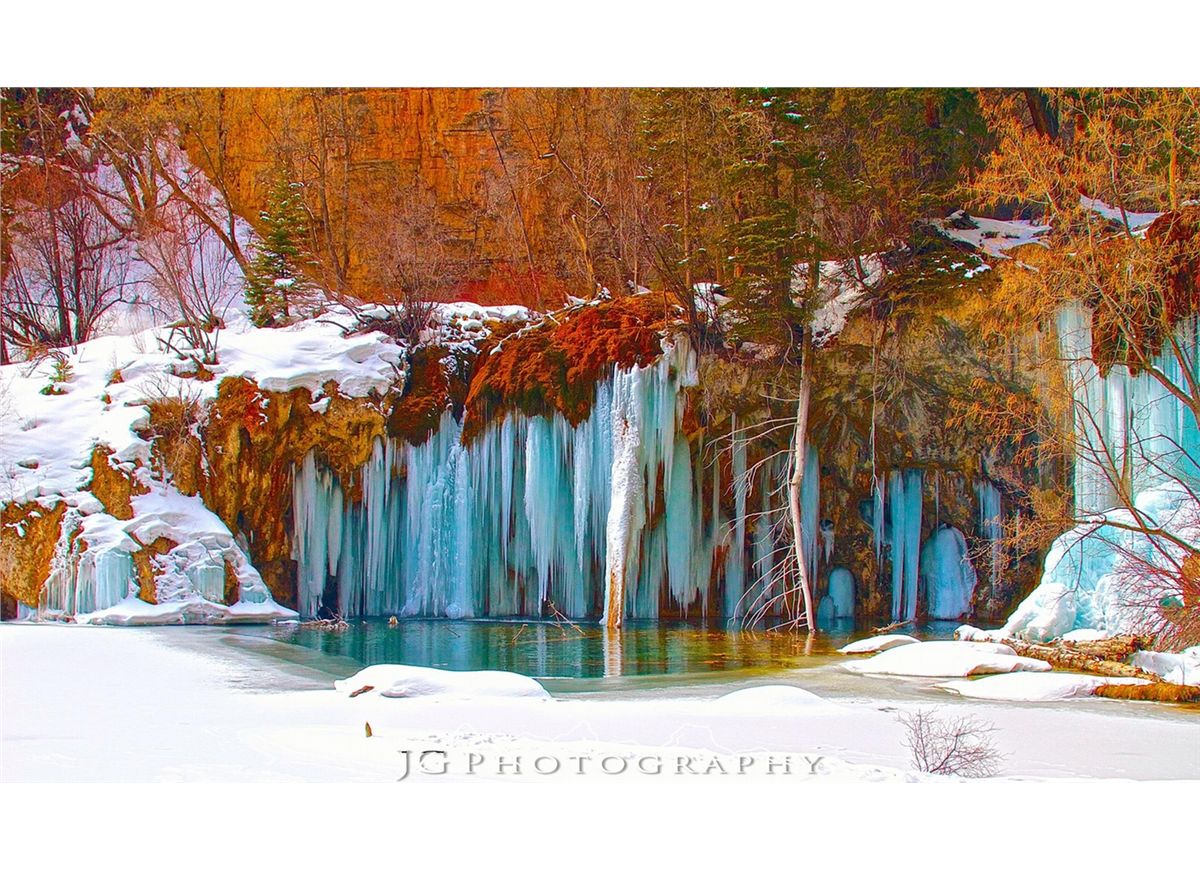 This 32"x48” photograph of Colorado’s Hanging Lake, near Glenwood Springs brings out the striking beauty of winter. Located at 7040 feet elevation, many tourists visit this special site by climbing a forest trail. A unique fact is the fragile shoreline of Hanging Lake is composed of travertine, created when dissolved limestone is deposited on rocks and logs.