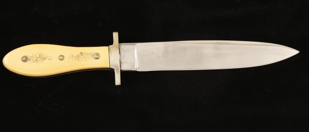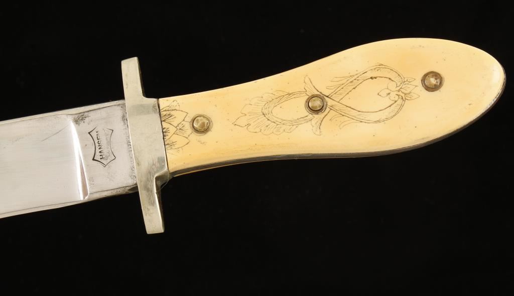 Features a single-edged 6-1/2" blade and full length tang. Non-ferrous metal handguard with hand etched hilt, brass rivets and a silver accented leather sheath.