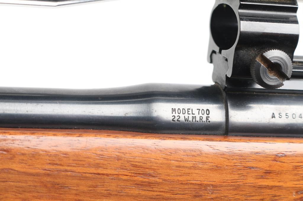 H&R semi-automatic rifle chambered in .22 WMR. Blow back action,blue finish, 22" barrel with dovetailed raised front blade, adjustable flip notch rear sights, thumb safety on right receiver, one piece smooth walnut pistol grip stock, sling studs and black plastic factory buttplate. Comes with two 15-rd magazines. Mounted with a Weaver Challenger 3x9 scope, Weaver see through rings, duplex reticle, clear optics. Bore is excellent/bright, finish and wood are excellent with a few minor scratches. Manufactured 1976-86.NRA Condition-Excellent. Modern Firearm