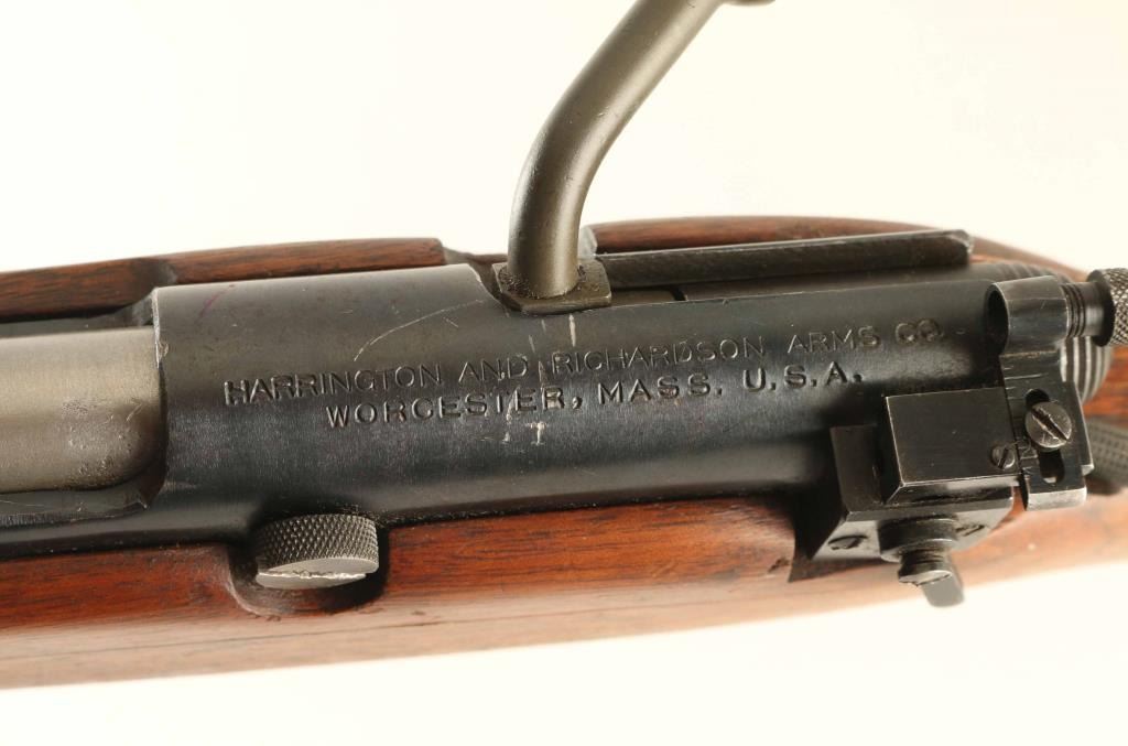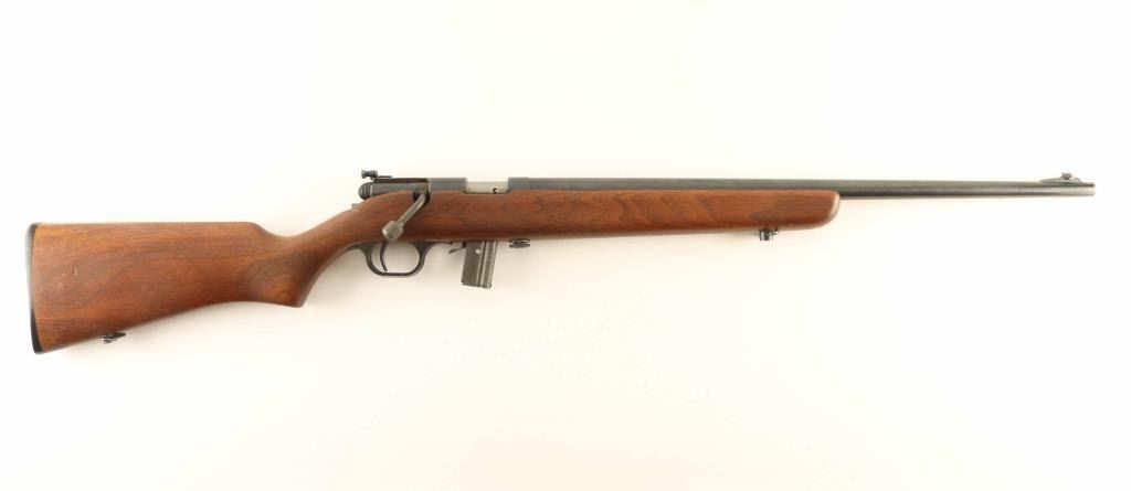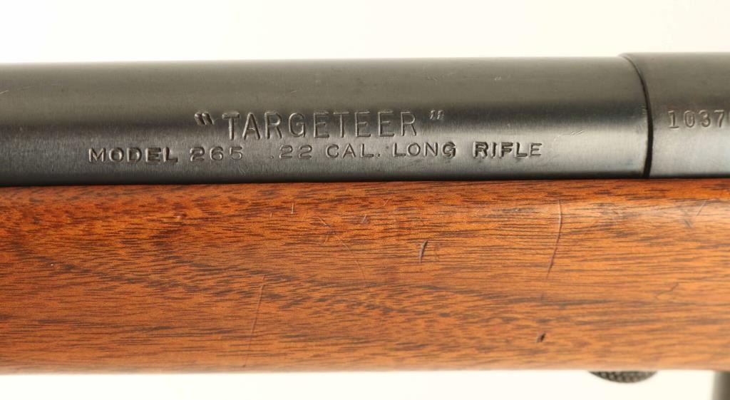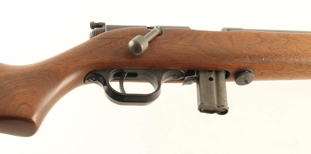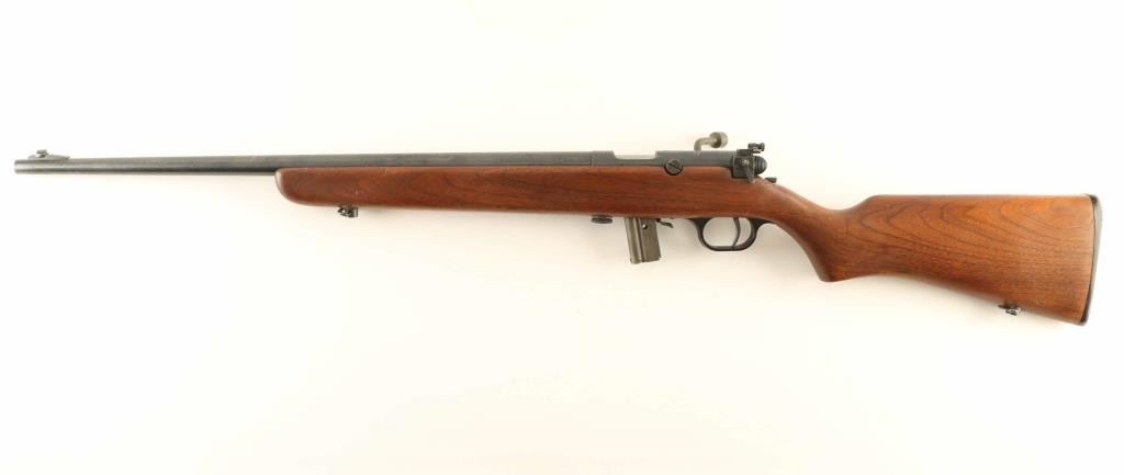 *** Requires Repair *** SN: 10376 "Targeteer" Bolt action rifle features blued finish on most metal parts, parkerized bolt, wood stock with curved grip, plastic buttplate, 22" barrel, adjustable target sights with receiver mounted rear peep sight, manual safety, sling swivels, detachable magazine. Bore is very good condition. Metal parts retain 85% finish with some bare metal visible on edges, cleaned patina spot on barrel, other signs of use & handling. Bolt body has moderate pitting over much of the forward part, cleaned and now in the white. Stock is very good with few dents and scratches. Includes one magazine. Action is a bit stiff and appears to be non-functional, requires gunsmith repair. Condition is Good - requires repair *** C&R Firearm ***