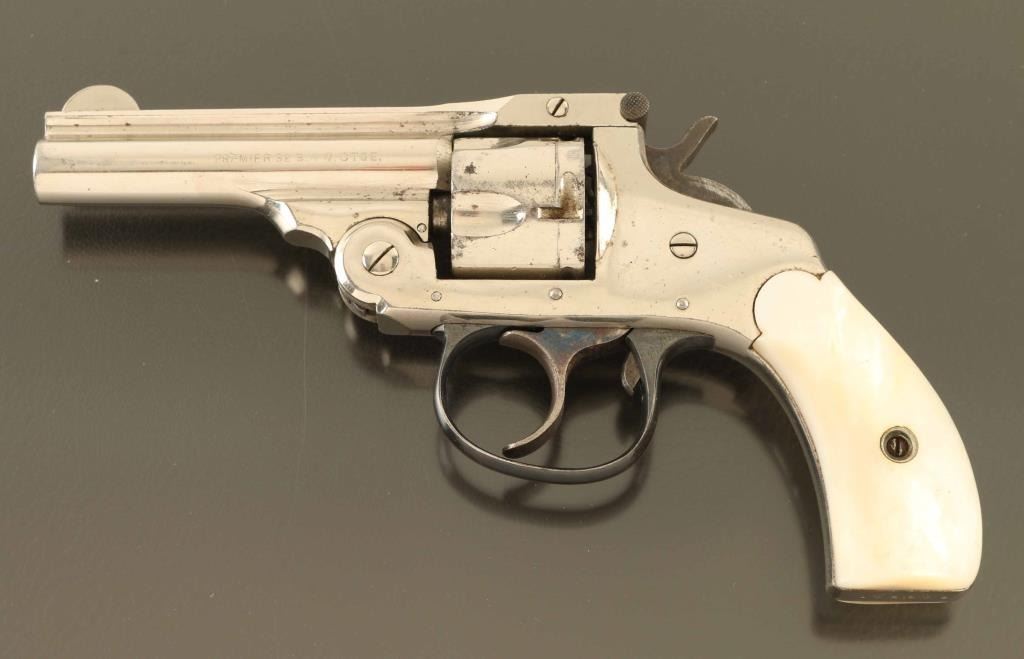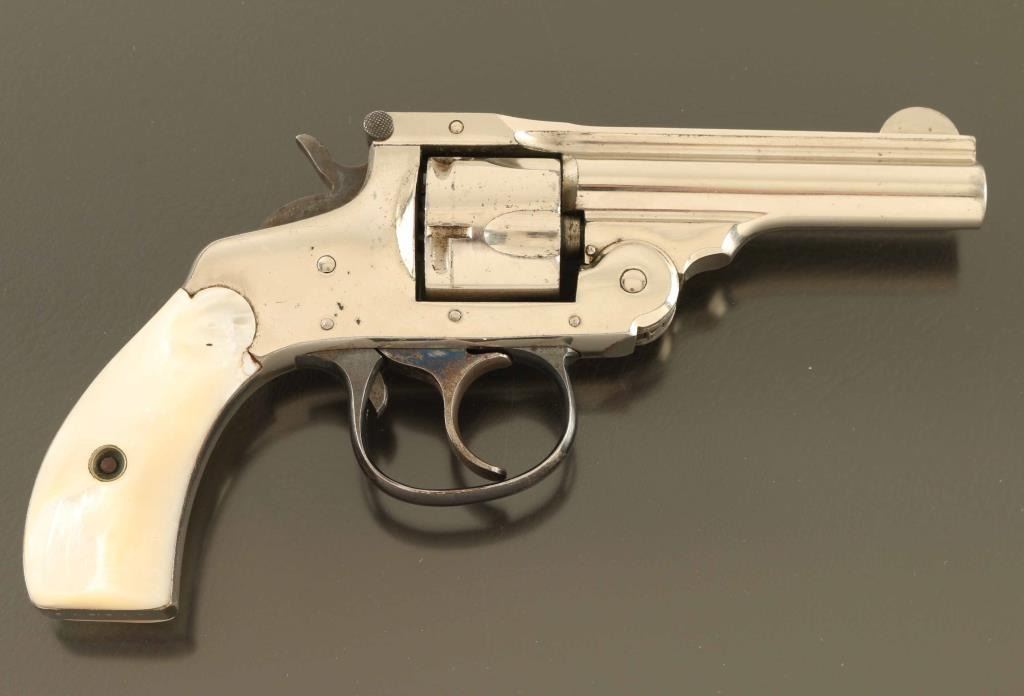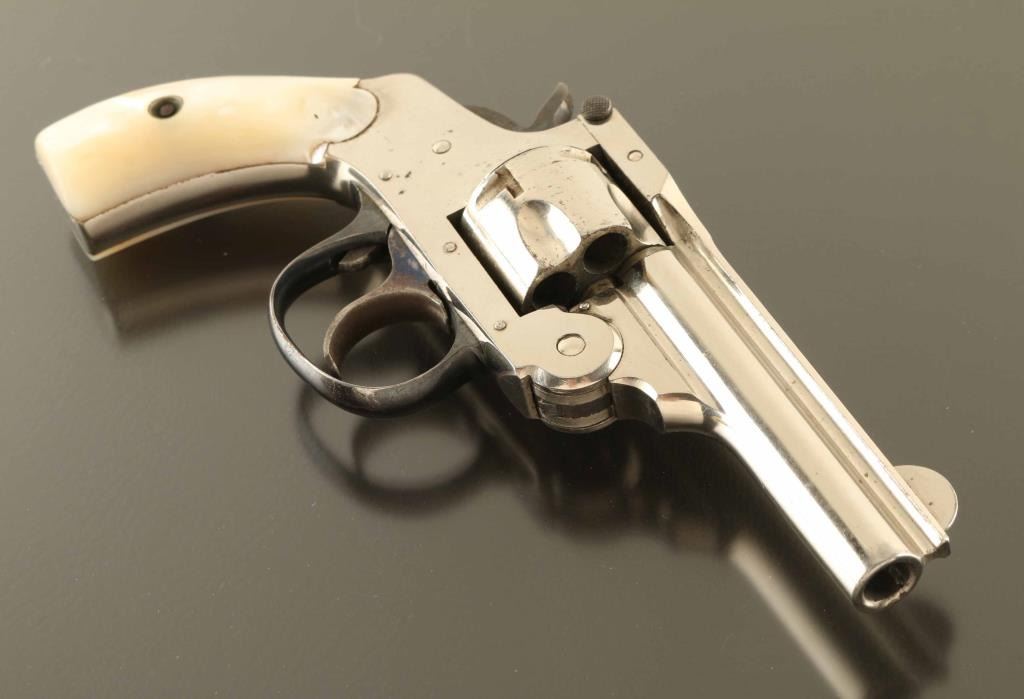 SN: 175575 Double action top-break revolver. Features 3" barrel, nickel finish, blued triggerguard, pearl grips. Bore is fair condition, dark with strong rifling, might improve with cleaning. Nickel finish is good to very good with few signs of clouding, flaking or peeling. Grips are good solid condition. Ejector star does not automatically reset after ejecting. Operation is single and double action is generally sound. Condition is NRA Poor - needs repair *** C&R Firearm ***