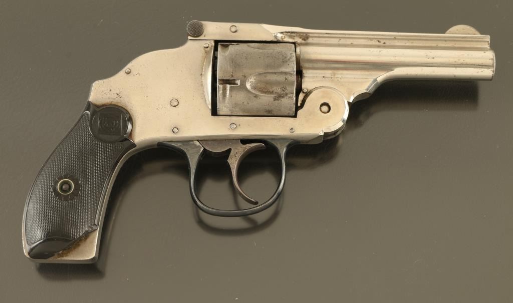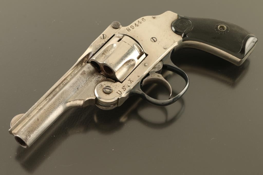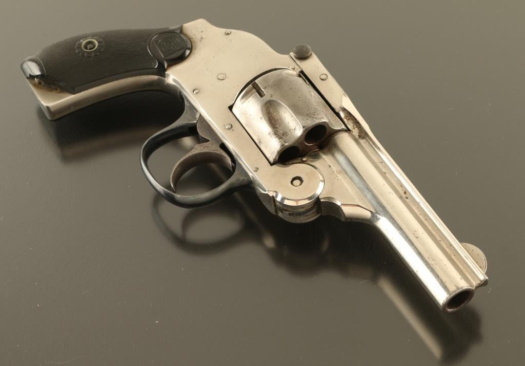 .38 S&W SN: 89446 Double Action Only break top revolver features nickel (or chrome) finish, black checkered Gutta Percha grips with Target logo, 3.25" barrel, fixed sights, 5 shot cylinder. Bore is poor to fair condition, dark with pitting, much rifling remaining. Charge holes are fair condition. Retains 40% bright nickel finish with cloudiness, pitted bare metal on most of left side of barrel and sides of cylinder, some small areas of peeling or flaking. Trigger guard is blued, good condition. Grips are overall good condition with right panel missing pieces at butt. Action operates fairly smooth, with tight cylinder lock-up when fired, trigger return is sticky, cylinder rotates freely when trigger is forward. Condition is NRA Fair *** C&R Firearm ***
