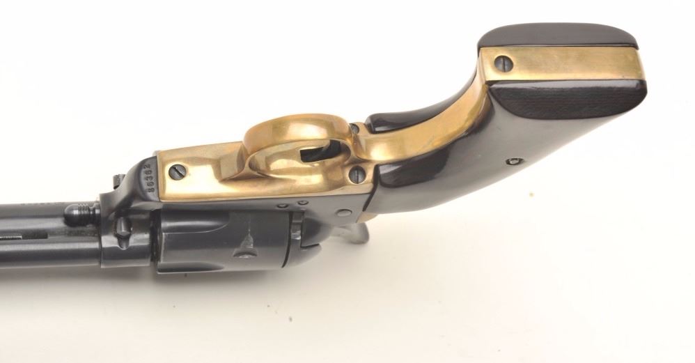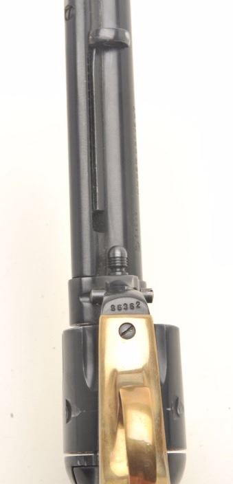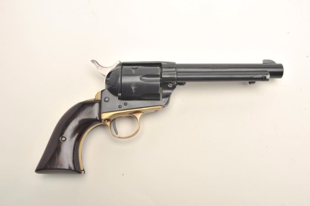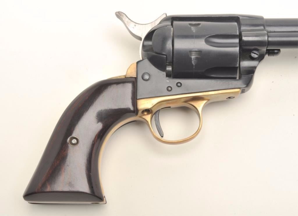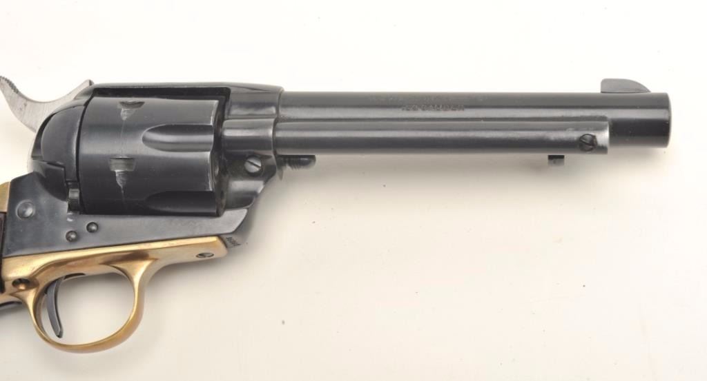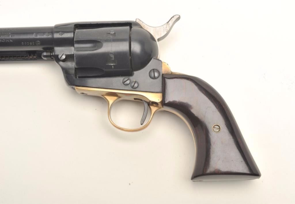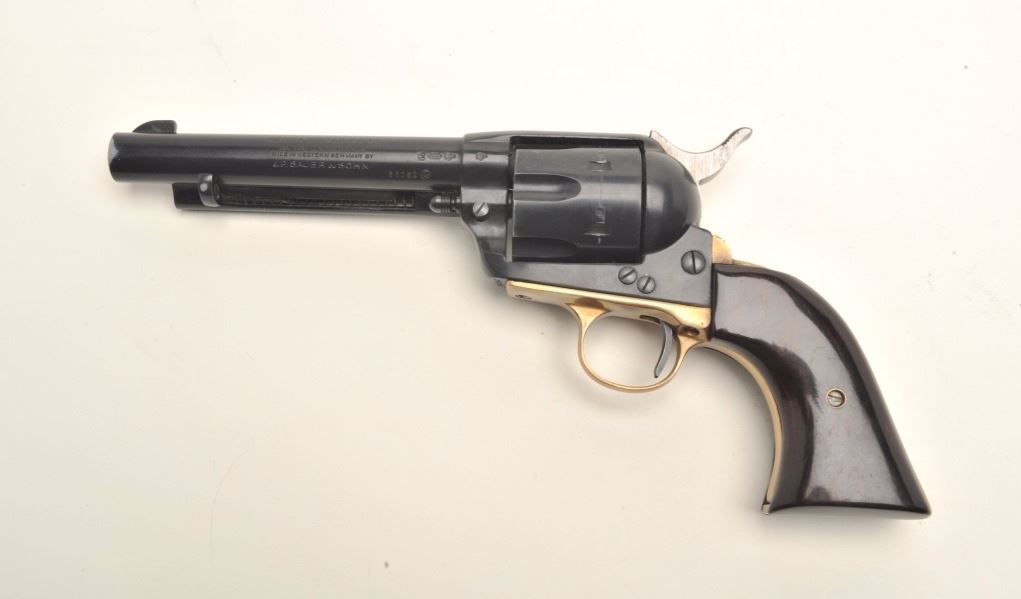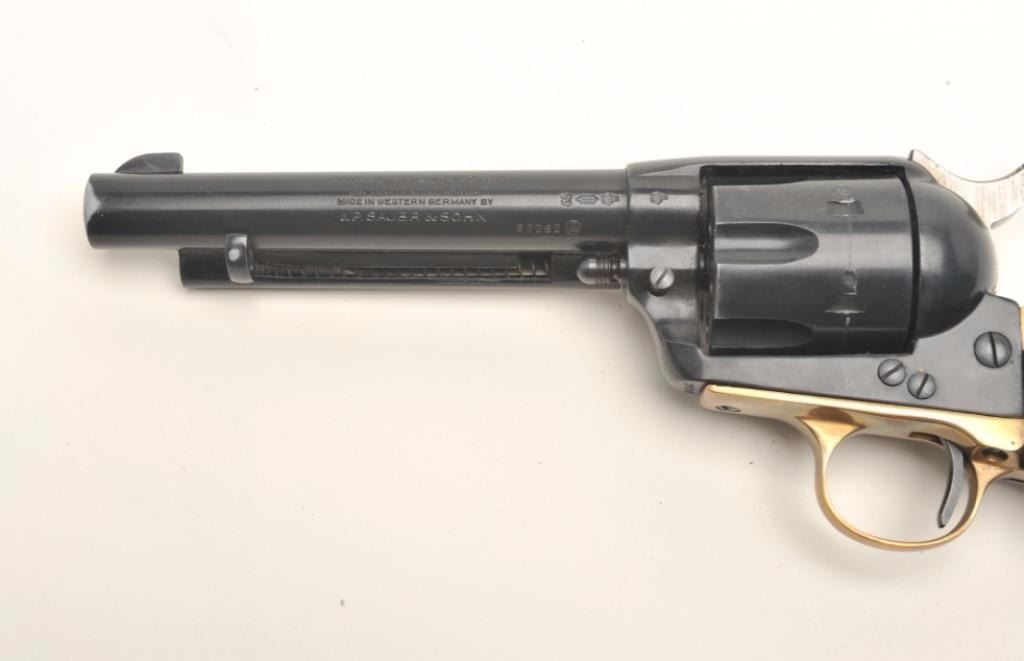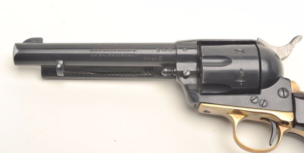 Hawes by J.P. Sauer & Sohn SAA revolver, .22 caliber, 5.5” barrel, blued finish, wood grips, brass straps, S/N 86362, in overall very good condition showing the majority of its blued finish, some muzzle wear, crispaction, sharp markings, good bore, very good grips. (Modern/PPT). Est.: $300-$500.