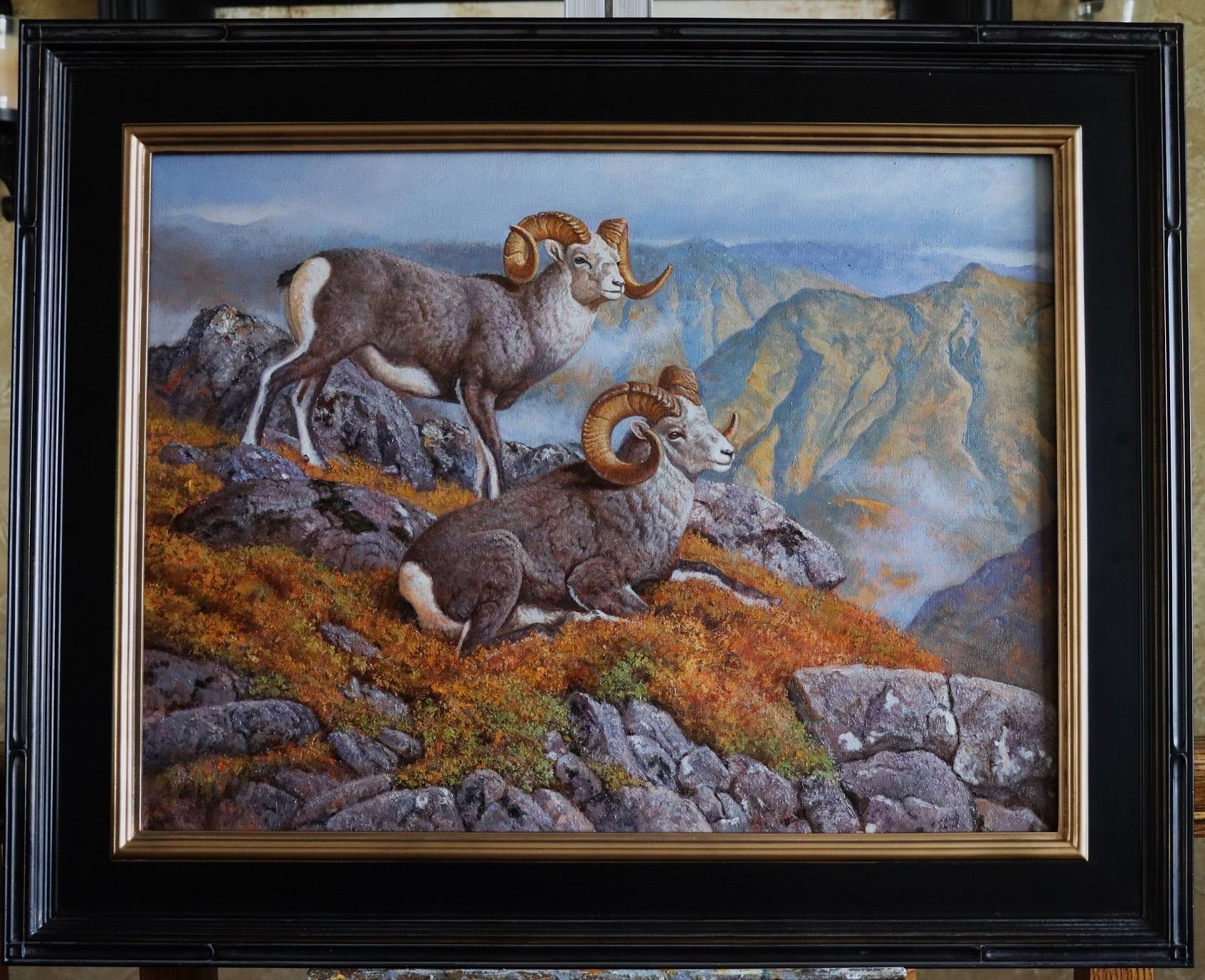 Beautiful original oil painting (18"x24") depicting two Stone Sheep Bighorns on the top of the mountain.