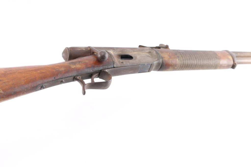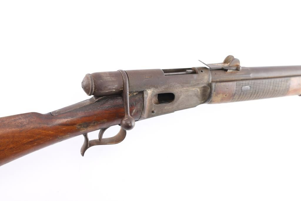 SN: 11777. NOTE*-Parts/Repair gun, missing the upper forearm. Antique Swiss Infantry rifle, Vetterli M 1869, Rare maker "Hch. Rychner, A. Aarau" with swiss Cross stamped on left receiver. Serial number matched on receiver, barrel and stock. 1871 the Model 1869 was updated by removing the loading gate and magazine cutoff switch, designated the Model 1869/71. 33" barrel, blade front sight, elevation adjustable rear sight graduated from 200 to 1,000 meters, 12 round tubular magazine, smooth trigger, finger rest trigger guard, cocked indicator on the rear if the bolt, rear checkered wood forend with the front handguard, 2 barrel bands and cleaning rod missing. Bore is fair, rifling present, scattered light pitting, metal is covered in a brown/gray patina, some dried cosmoline, action works well and the wood is sound.