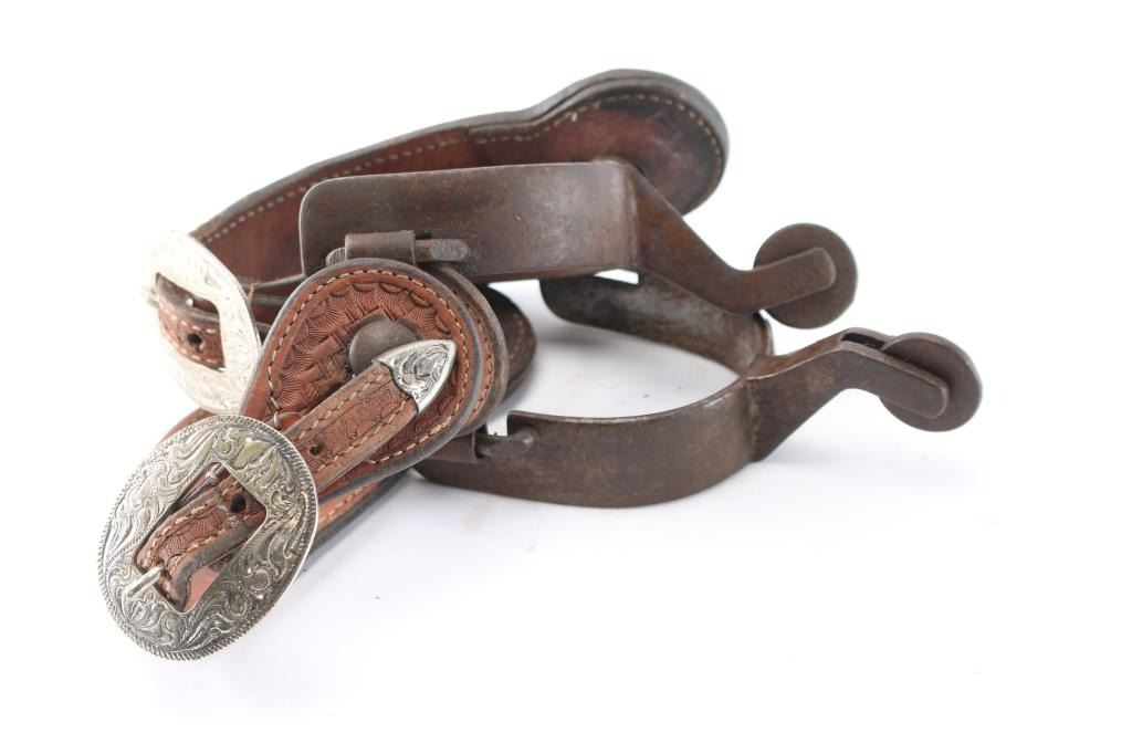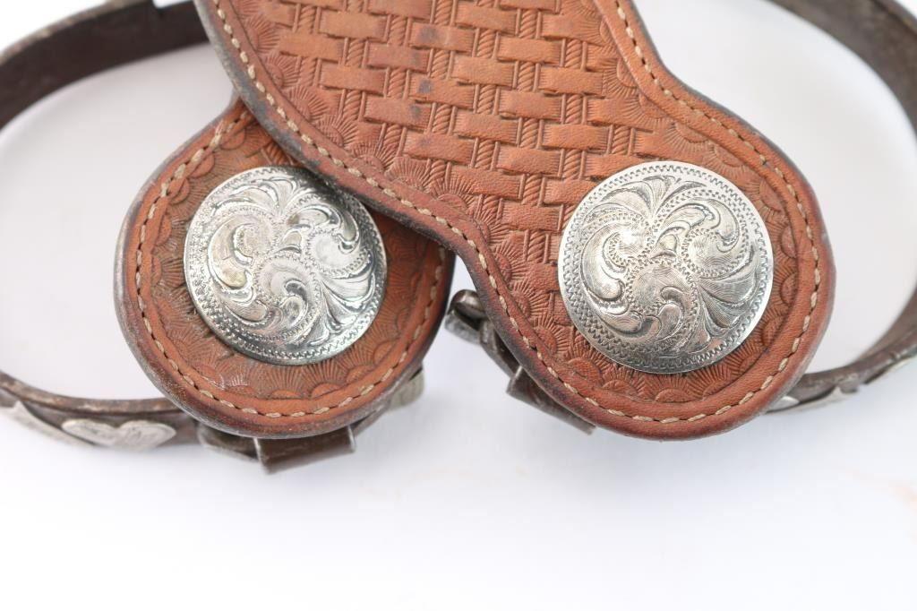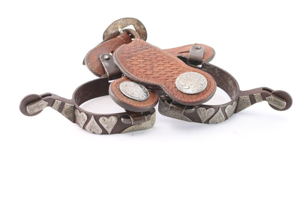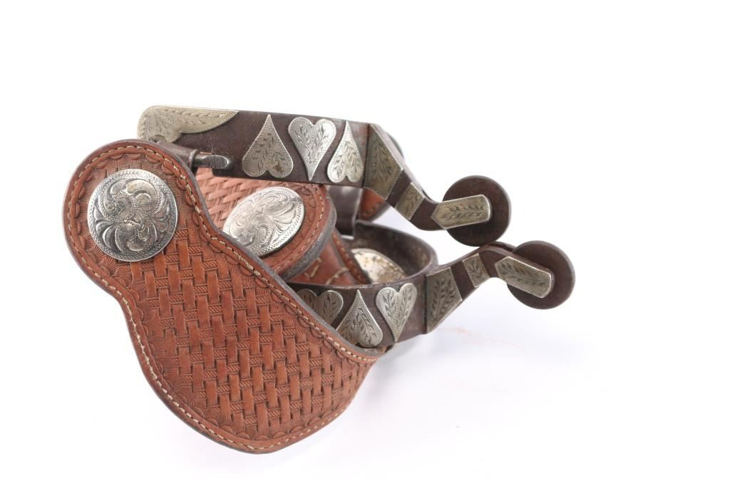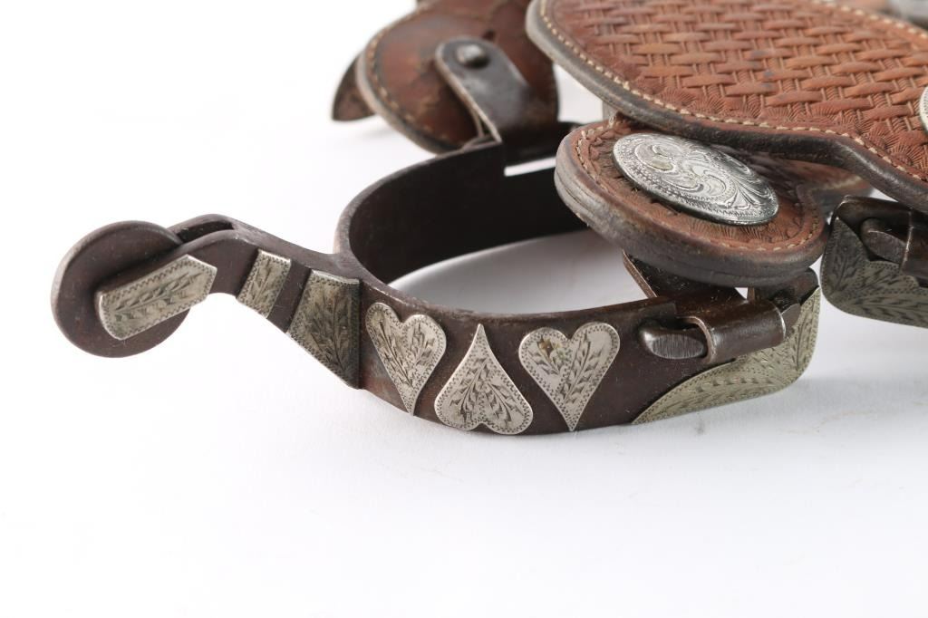 Silver Overlaid Heart Design On Straps With Basket Weave Tooled Spur Straps.