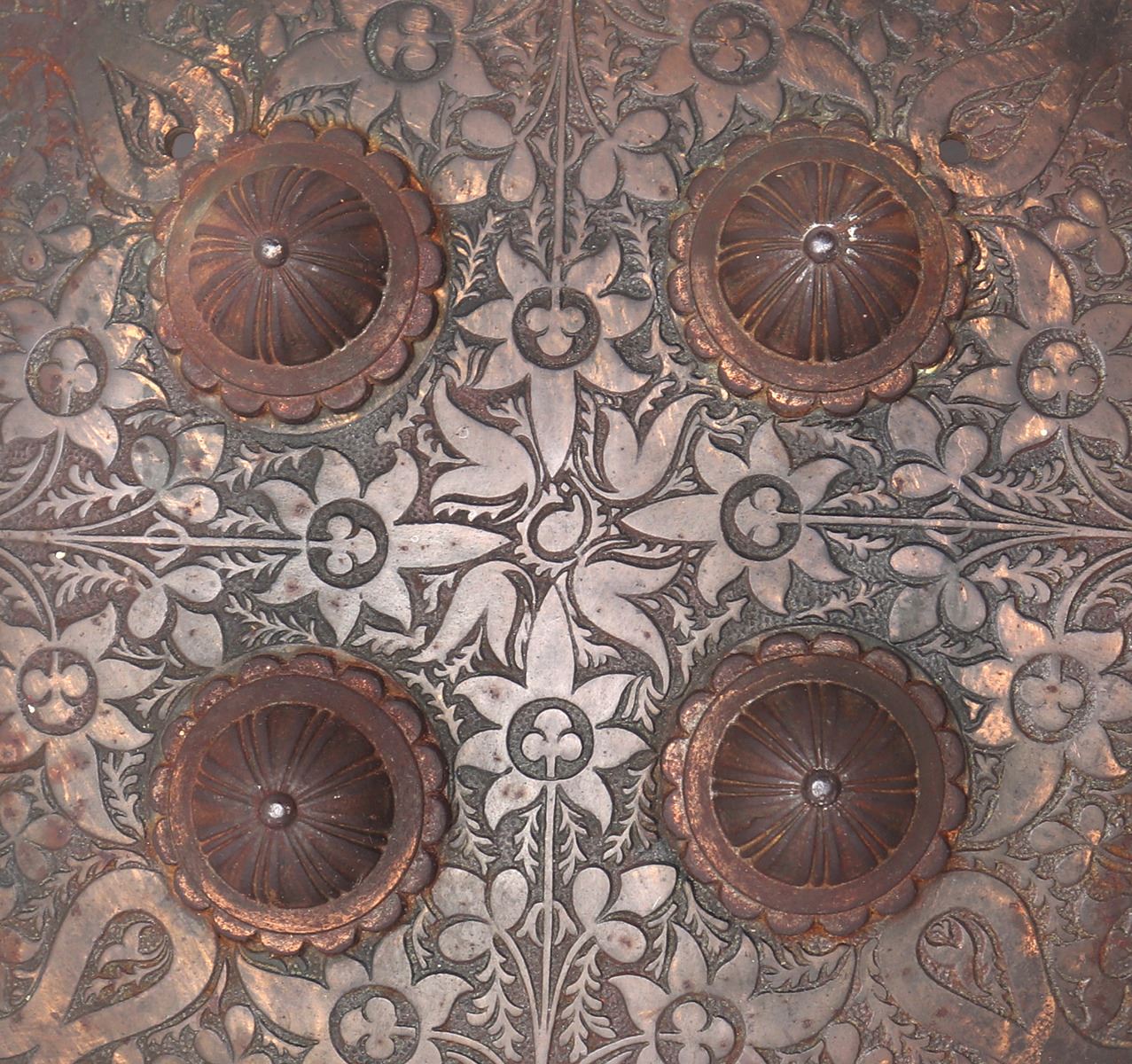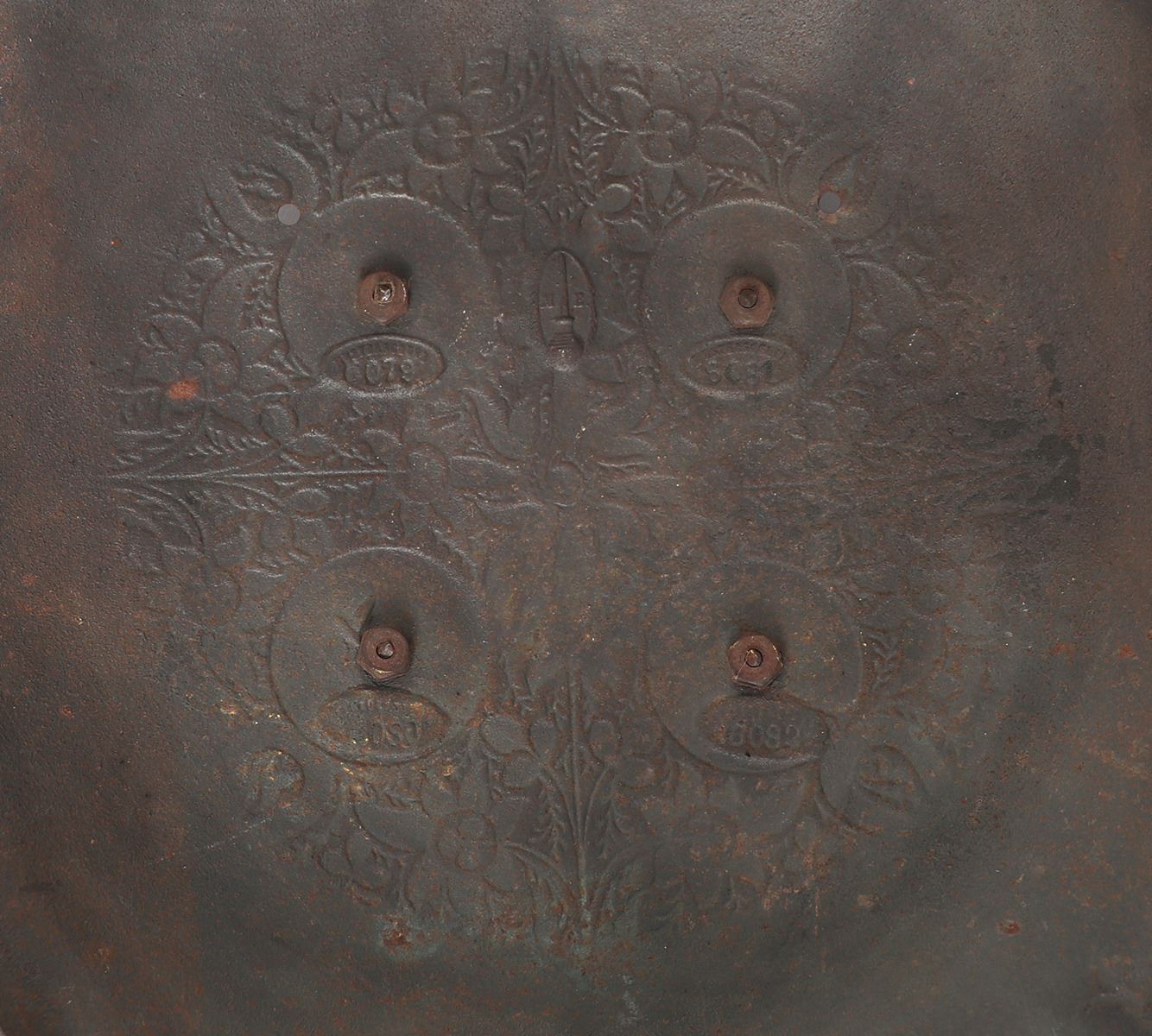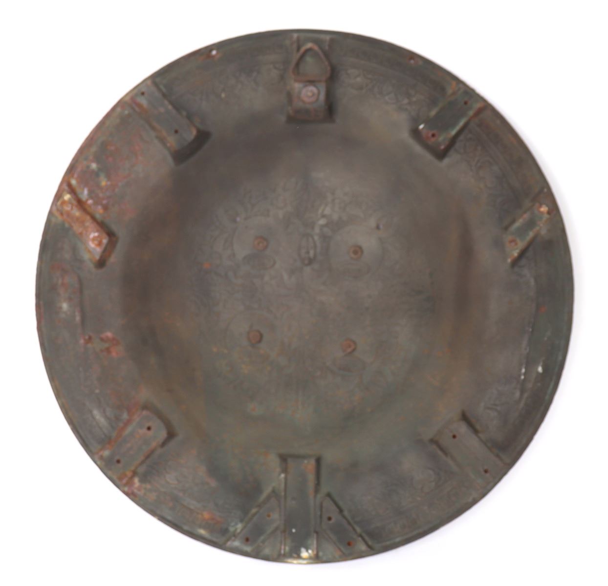 Historicism cast iron Dhal of a very heavy weight with decorated face and incised patterns of geometric designs throughout. Size 17 1/2" W