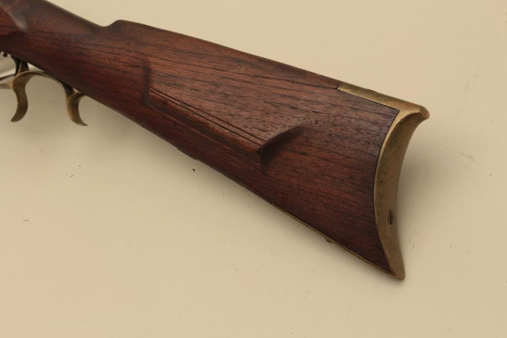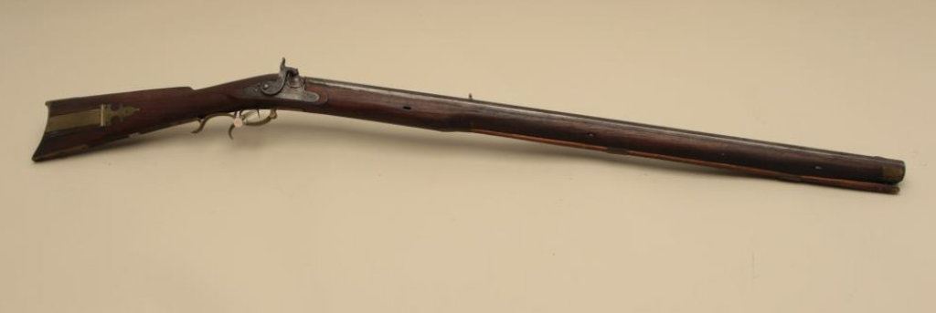 octagon barrel, full length wood stock, brass mounted including brass patchbox, double set triggers (working at time of description), in overall good condition with old pitting around the firing area, overall good wood showing some old repairs to mid forend cracks near top edges (understandable given the weight of this heavy barrel). (Antique). Est.: $600-$1,200.
