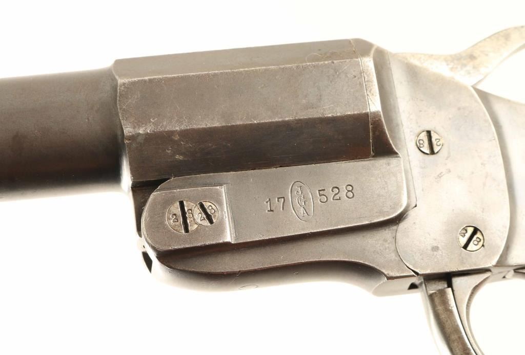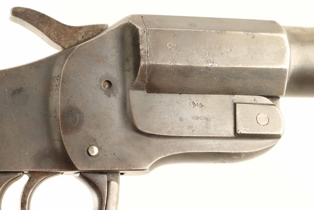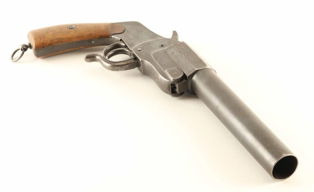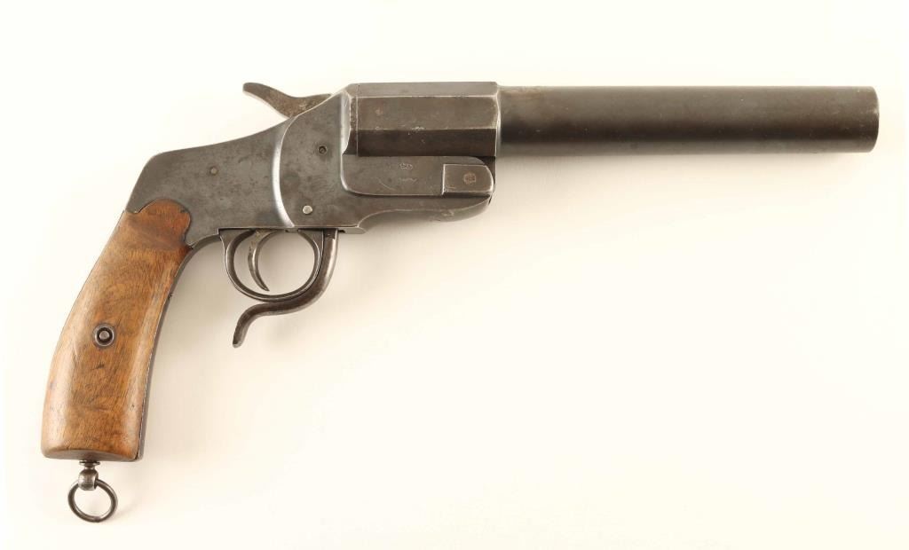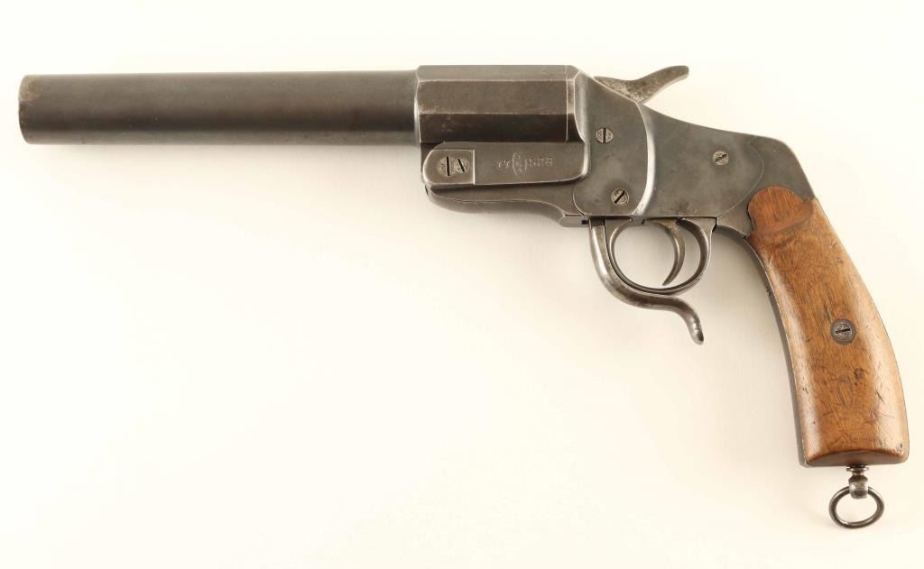 #17-528 German flare launching pistol features approx 9" smooth bore barrel, break open single shot action, single action trigger, lanyard ring on bottom of grip. Bore is good condition with light roughness. Metal retains 80% blue, turning gray, bare metal at edges, patina beginning to form in places. Smooth wood grips are good or better condition. Markings include "JGA", eagle proofs, crown over "B", crown over "A", crown over "U", "4" inside circle. Screws marked "28" on heads. "JGA" purportedly stands for "JG Anschutz". Overall condition is Very Good.