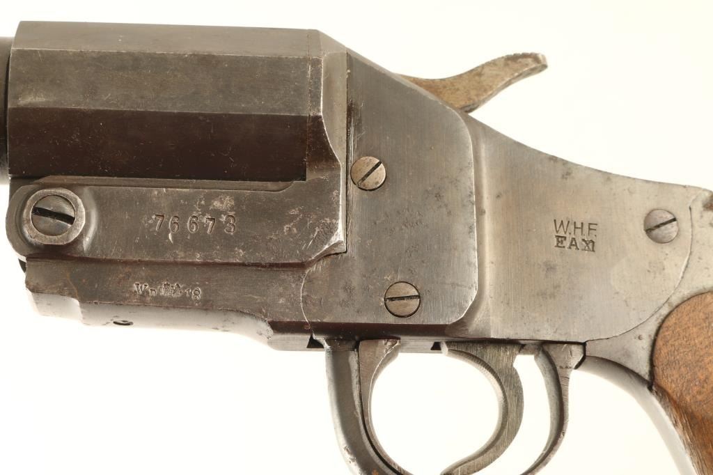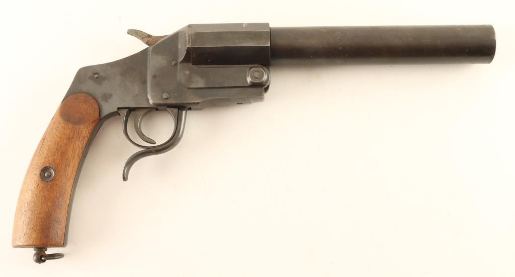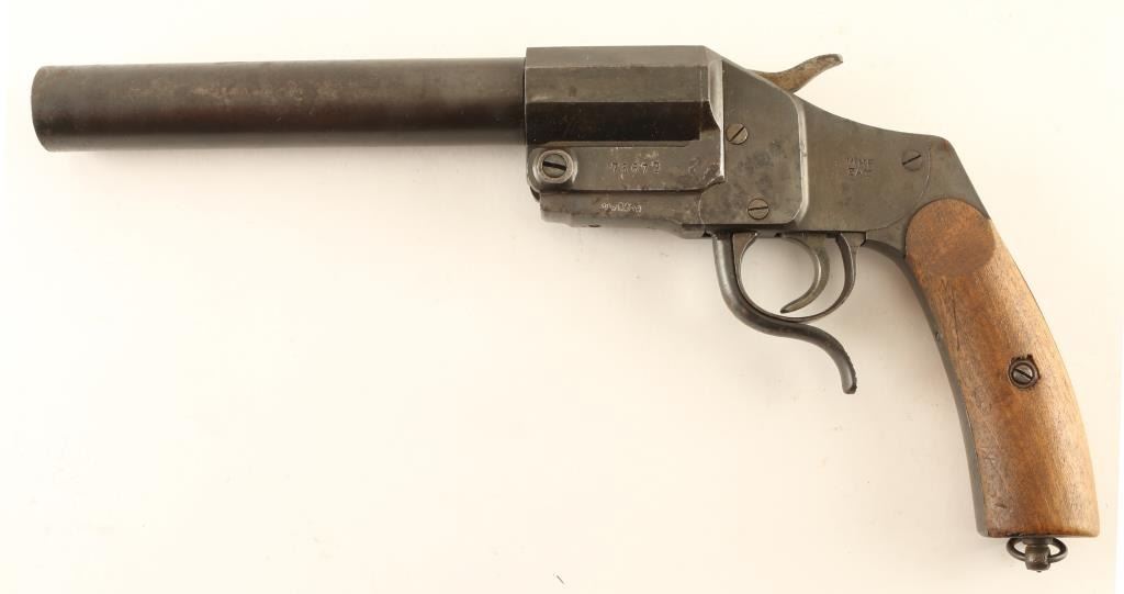 #76673 German flare launching pistol features approx 9" smooth bore barrel, break open single shot action, single action trigger, lanyard ring on bottom of grip. Bore is good condition with some light roughness. Metal retains much original bluing with small areas of roughness or pitting in places. Smooth wood grips are very good condition. Markings include "WHF", "EA XI", "Wn (castle) 18". Overall condition is Very Good.