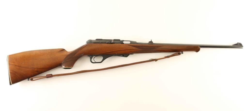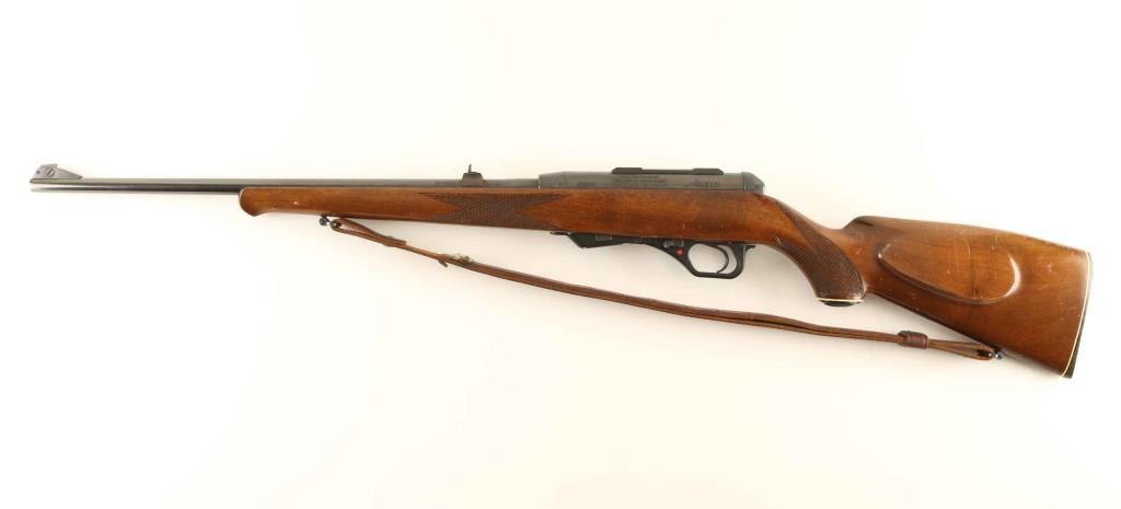 German made magazine fed semi-automatic sporting rifle chambered in .22 Magnum, manufactured circa 1978. Imported by Saco of Arlington, V.A. with import marks on the receiver. Features a blued finish, 19 3/4" barrel, ramped blade front sight adjustable for elevation, dovetailed rear sight with square notch on raised lug, integral scope mounts on the receiver, manual safety, serrated trigger, detachable 5 round magazine, smooth brown leather sling, serrated charging handle and checkered walnut pistol grip shoulder stock with schnabel forend, right handed cheek rest & factory buttplate. Rifle exhibits approximately 96% of it's original finish showing minor edge wear, some finish loss on the top of the scope mount and scattered handling marks. Action is smooth, the polygonal bore is mirror bright and the wood stock is good+ with many small blemishes. Condition is NRA Very Good++. ***Modern Firearm***