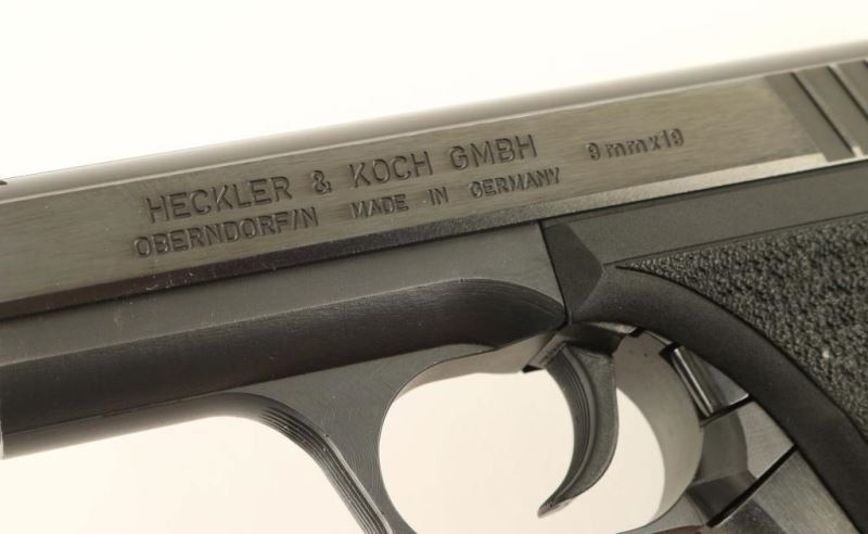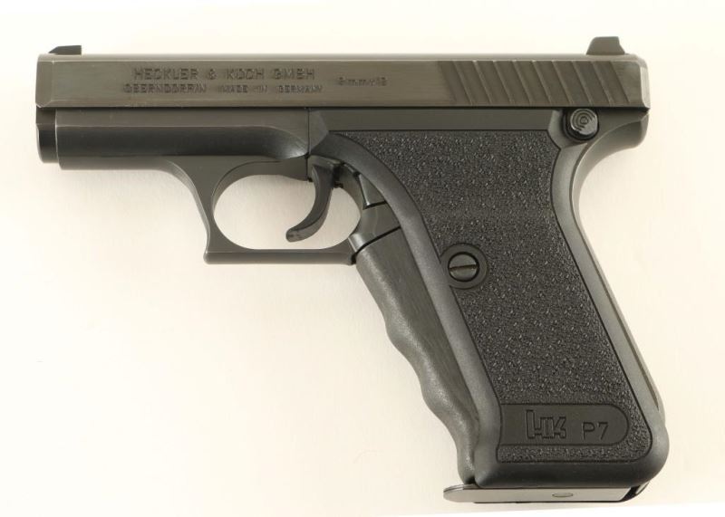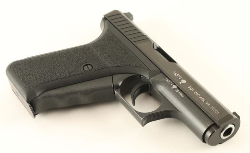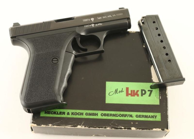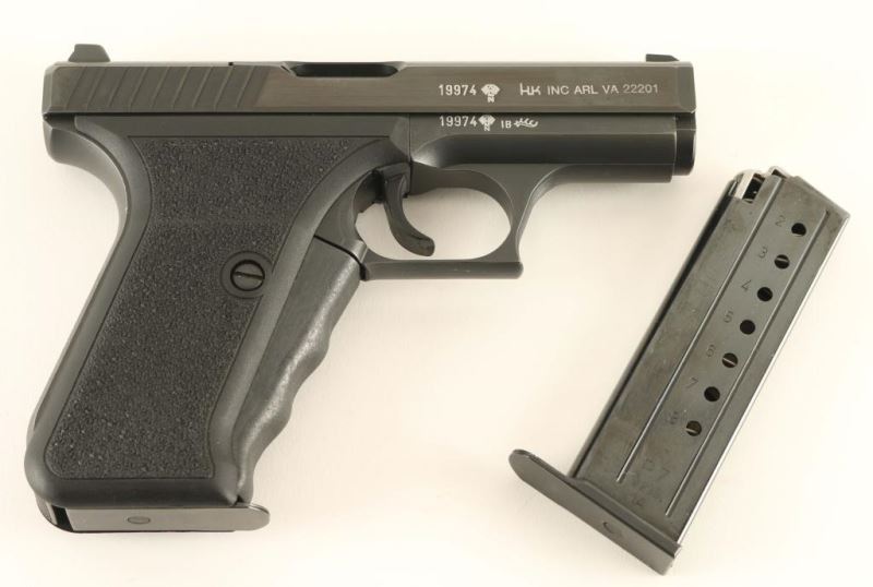 'PSP - Police Self-Loading Pistol' German made striker fired single action semi-automatic pistol chambered in 9x19mm, circa 1981. This uniquely engineered pistol utilizes a gas-delayed-blowback system and has a manual cocking lever built-in to the grip. Imported by HK Inc. of Arlington, V.A. with import marks on the right side on the slide. Features a blued finish, 4.1" barrel with polygonal rifling & fluted chamber, dovetailed high contrast three-dot sights, serrated trigger, small triggerguard, heel magazine release, factory 8 round magazine, steel frame, manual cocking lever that also functions as a slide release, lightly stippled grip straps and two-piece stippled black synthetic grips. Includes a factory cardboard box(likely original) with spare magazine, manual and the original warranty card & test target. Pistol exhibits approximately 99%+ of it's original finish showing a single small blemish on the right side of the slide below the "VA"portion of the import mark. Action is strong, bore is pristine and synthetic grips are fine. Likely unfired. Condition is like NRA new in box. ***Modern Firearm***