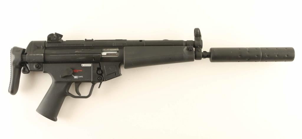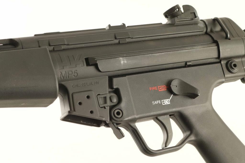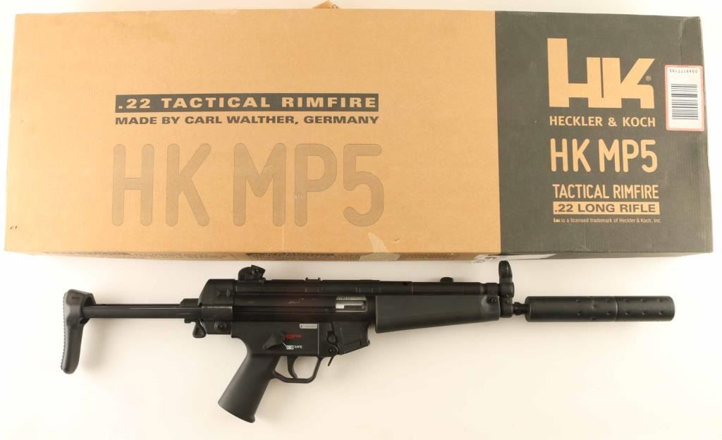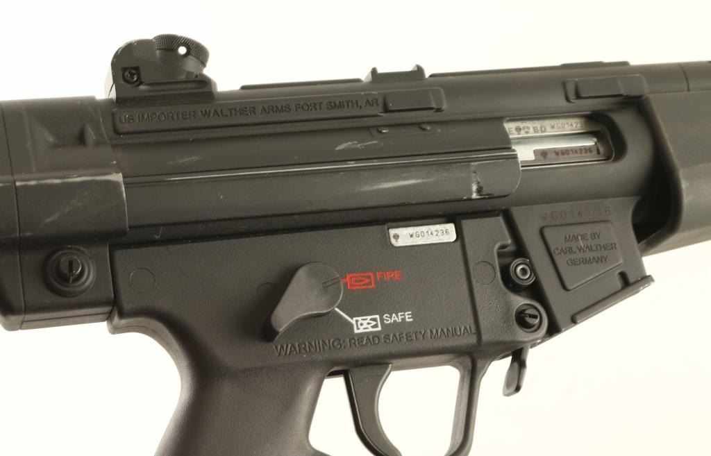 German semiautomatic rimfire rifle imported by Walther Arms, Fort Smith AR. Features 16" barrel with faux suppressor, black metal finish, collapsing stock, adjustable rear peep and post front sight, sling attachment points, manual safety. Bore is very good to excellent condition. Retains 85% finish with bare metal at several places from scuffs or where stock bars rub when retracted. Includes factory cardboard box. No magazine included. Condition is NRA Very Good *** Modern Firearm ***