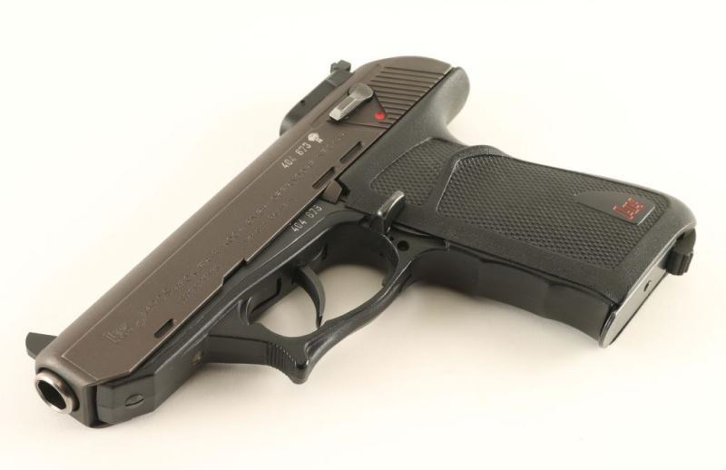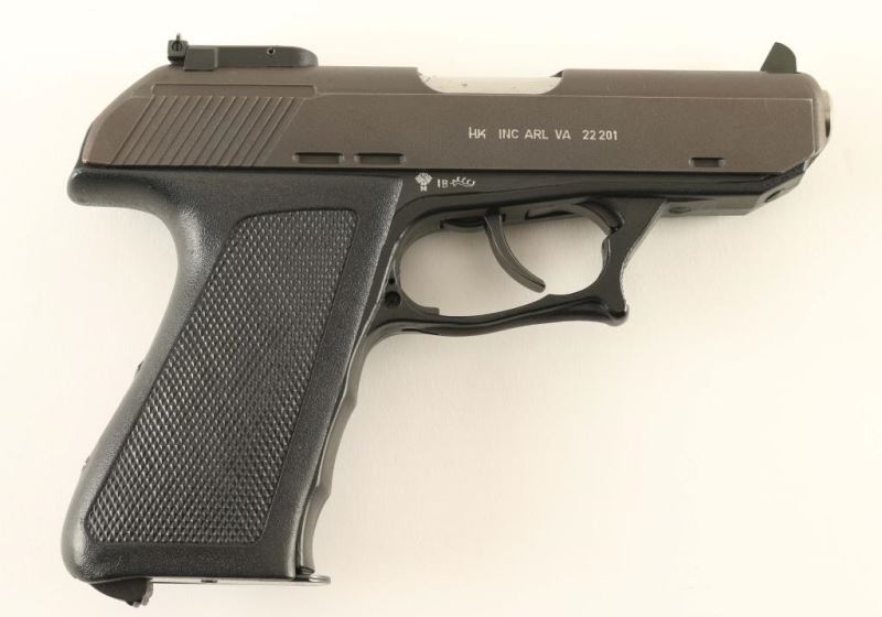 German made double action roller-delayed-blowback operated semi-automatic pistol chambered in .45 Automatic, circa 1981. Imported by HK Inc. of Arlington, V.A. with import marks on the right side of the slide. Features a phosphorus/blued finish, 4" barrel with polygonal rifling, dovetailed tall blade front sight w/ white strip, adjustable rear window sight, concealed hammer, thumb safety, cocked indicator, cocking lever w/ decocking & slide release functions, serrated adjustable trigger, adjustable trigger over-travel stop, black polymer trigger guard, heel magazine release, 7 round magazine and one-piece checkered black polymer wrap-around grip w/ thumb rest & HK insignia on the right side. Pistol exhibits approximately 99%+ of it's original finish showing only slight high point edge wear. Action is smooth, bore is pristine and polymer grips are fine. Condition is NRA like new. ***Modern Firearm***