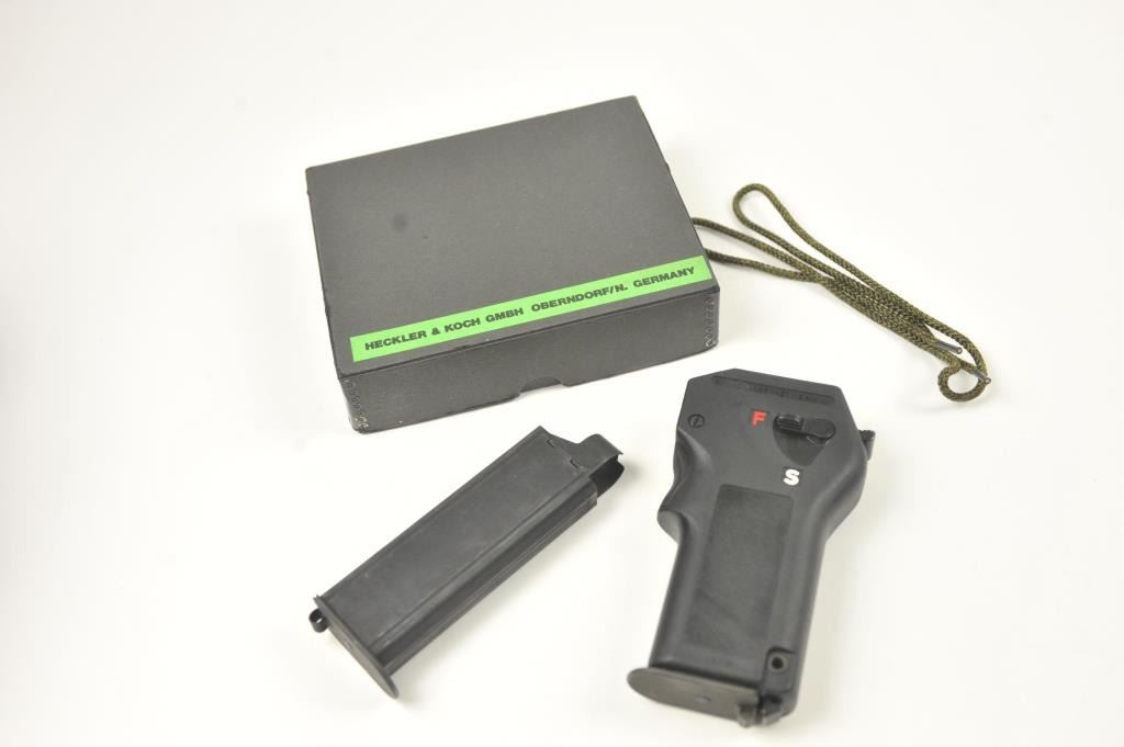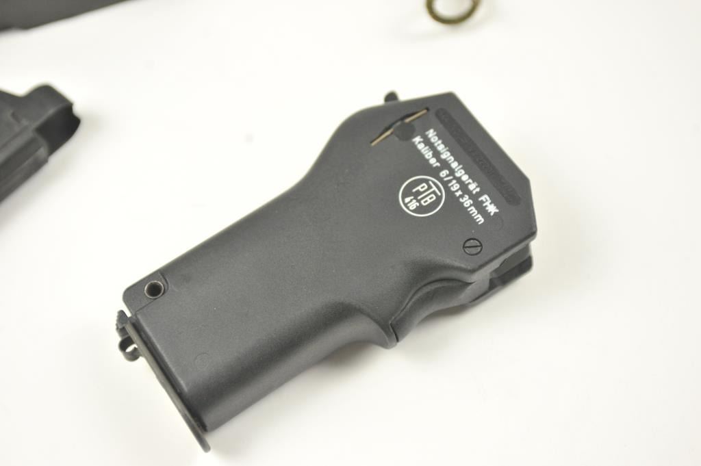 Heckler Koch PTB 416 19mm magazine loading flare pistol, NSNV, polymer construction, with 5 round detachable magazine. Pistol is in fine overall condition, showing light use, in original box with owners manual.Includes 15 19x36mm flares. Est. $150-300