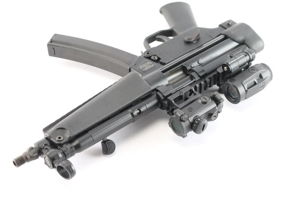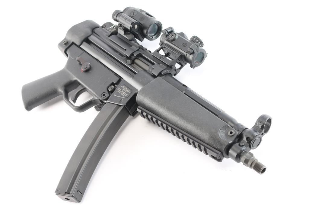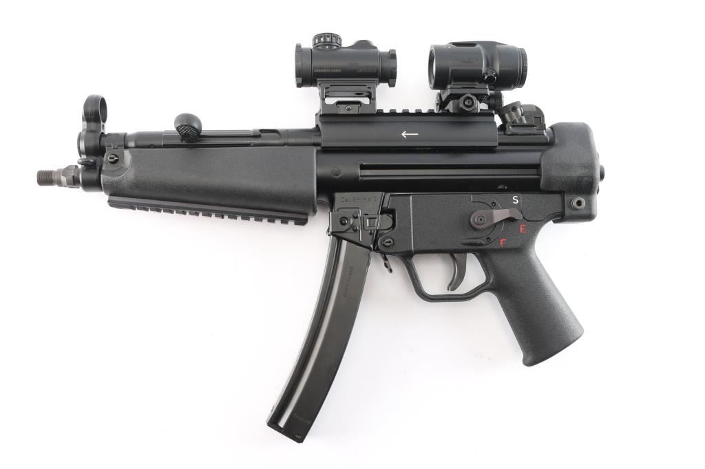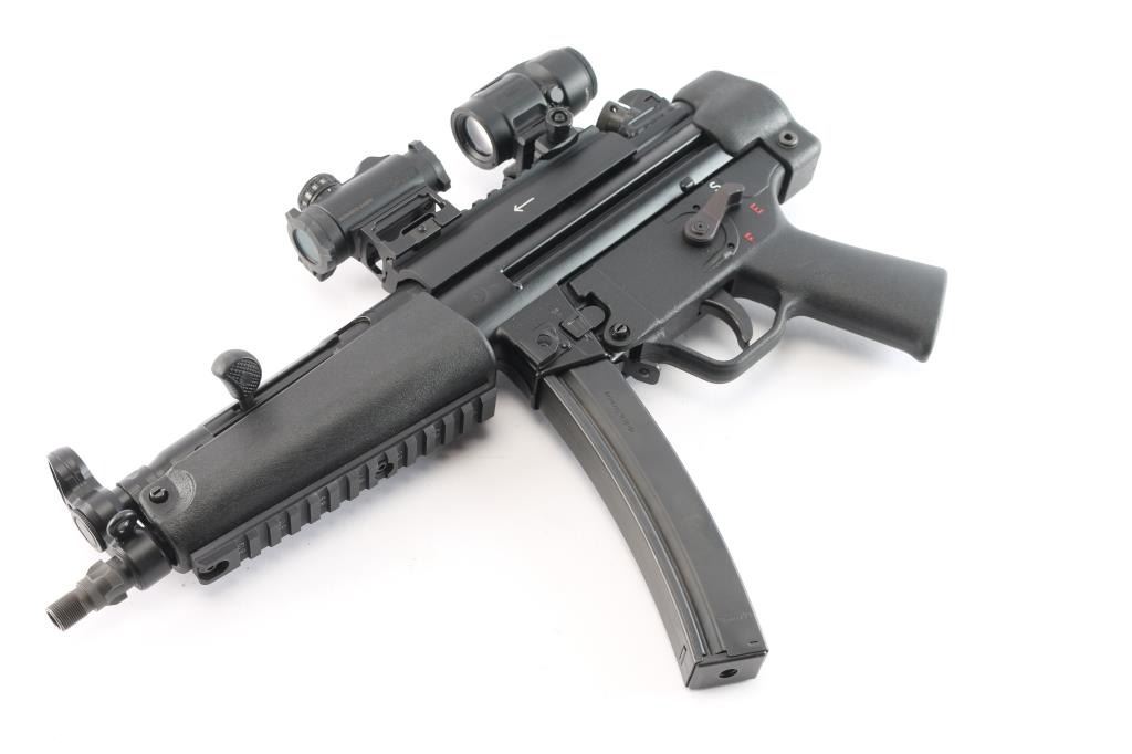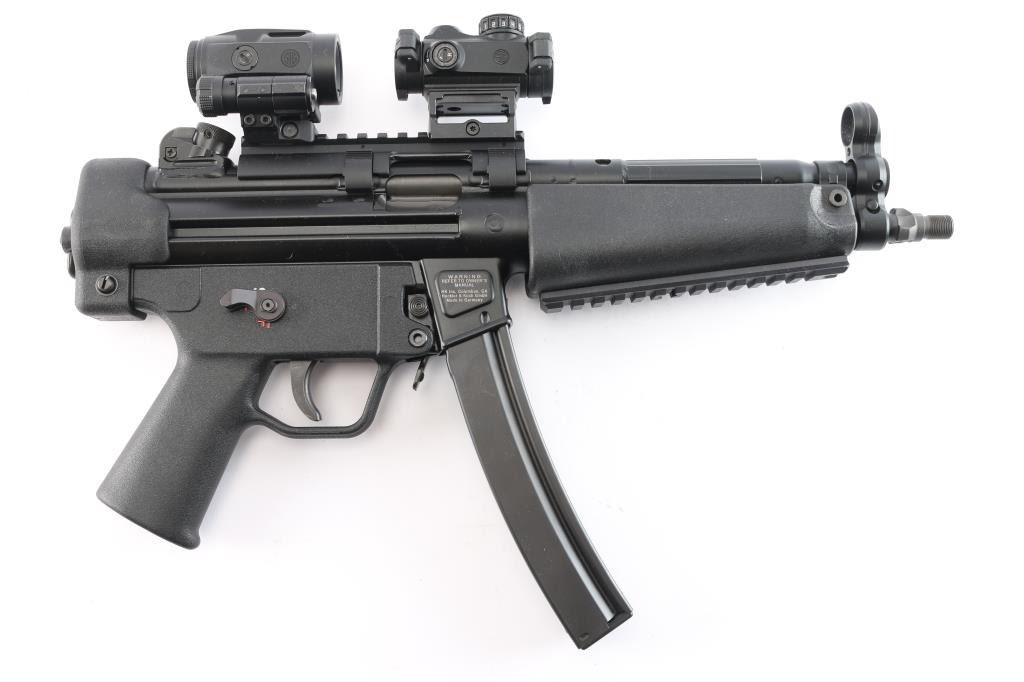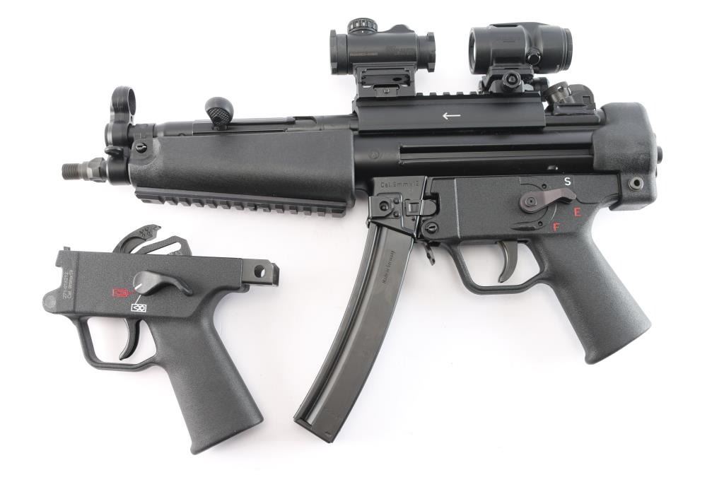 German semiautomatic pistol imported by HK Inc, Columbus GA. Features matte black finish, black polymer furniture, 9" 3-lug barrel, threaded muzzle without thread protector cap, ring protected post front sight, adjustable drum rear sight, ambidextrous manual safety. Sig Sauer Romeo and Juliet sight combination installed. Franklin Armory HK SP5 Binary Trigger Group has been installed, the original factory H&K trigger group is included with the gun. Overall condition is like new. Bore is pristine. Includes one 30 rd factory magazine.