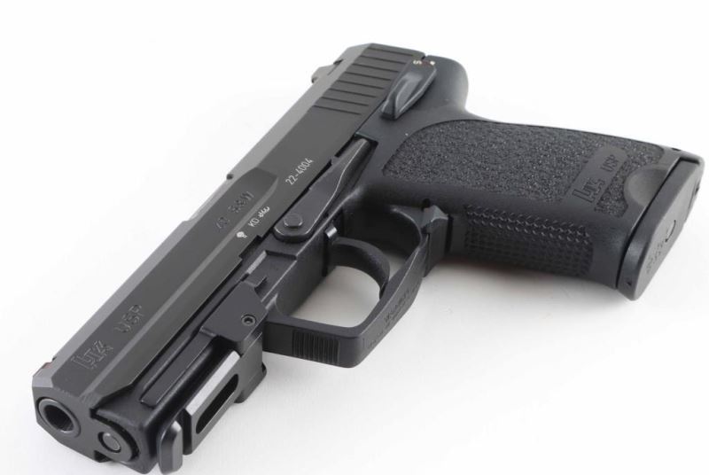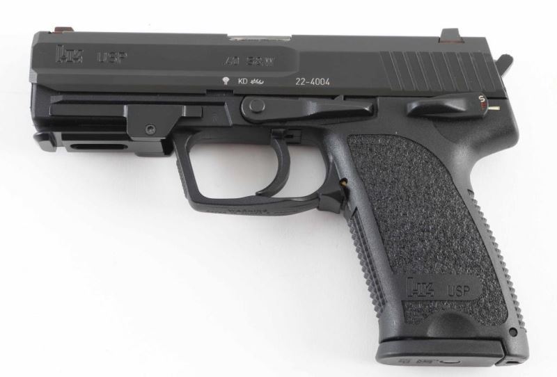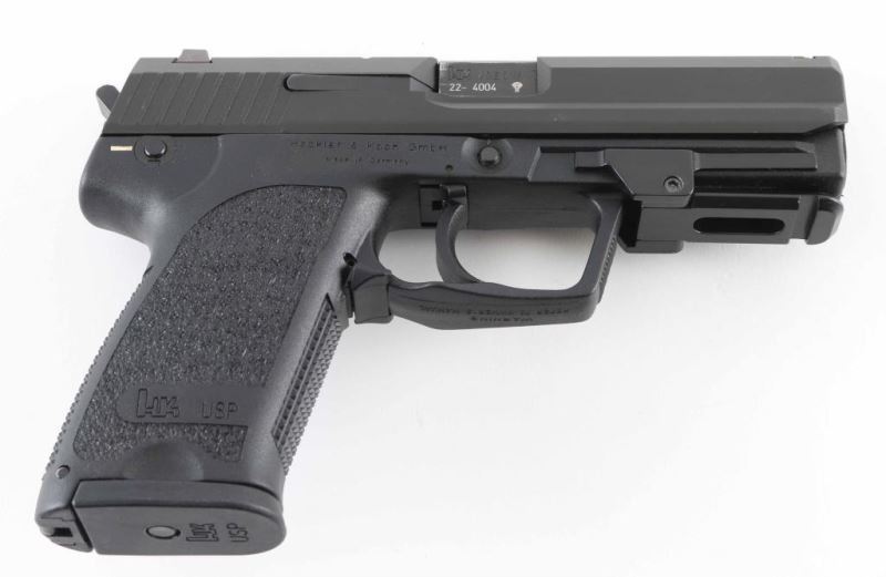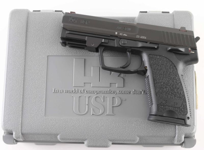 Semiautomatic pistol made in Germany, imported by Heckler & Koch Inc, Sterling VA. Features matte black finish, black polymer frame with accessory rail, double/single action trigger, manual decocking safety, 4.25" barrel, 3 dot sights in dovetails. Installed rail conversion adapter provides mounting for aftermarket accessories. Bore is very good condition. Retains 95% finish with handling marks and signs of use, barrel hood shows bare metal. Includes (1) magazine, factory hard plastic case. Condition is NRA Excellent *** Modern Firearm ***