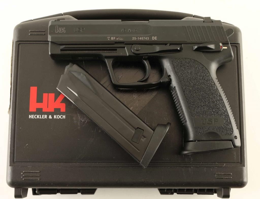 German semiautomatic pistol chambered in 45acp, imported by HKI, Columbus GA. Features 4.25" barrel, blackened steel parts, black polymer frame, 3 dot sights, ambidextrous magazine release, accessory rail at dust cover, frame mounted safety/decocker, HK Lockout System. Bore is in excellent condition. Metal finish shows thinning at some sharp corners on slide, and thin lines of bare metal on barrel hood. Includes two magazines, HK plastic carry case, manual, fired case, HK sticker, key for HK Lockout System. Condition is NRA Excellent ***Modern Firearm***