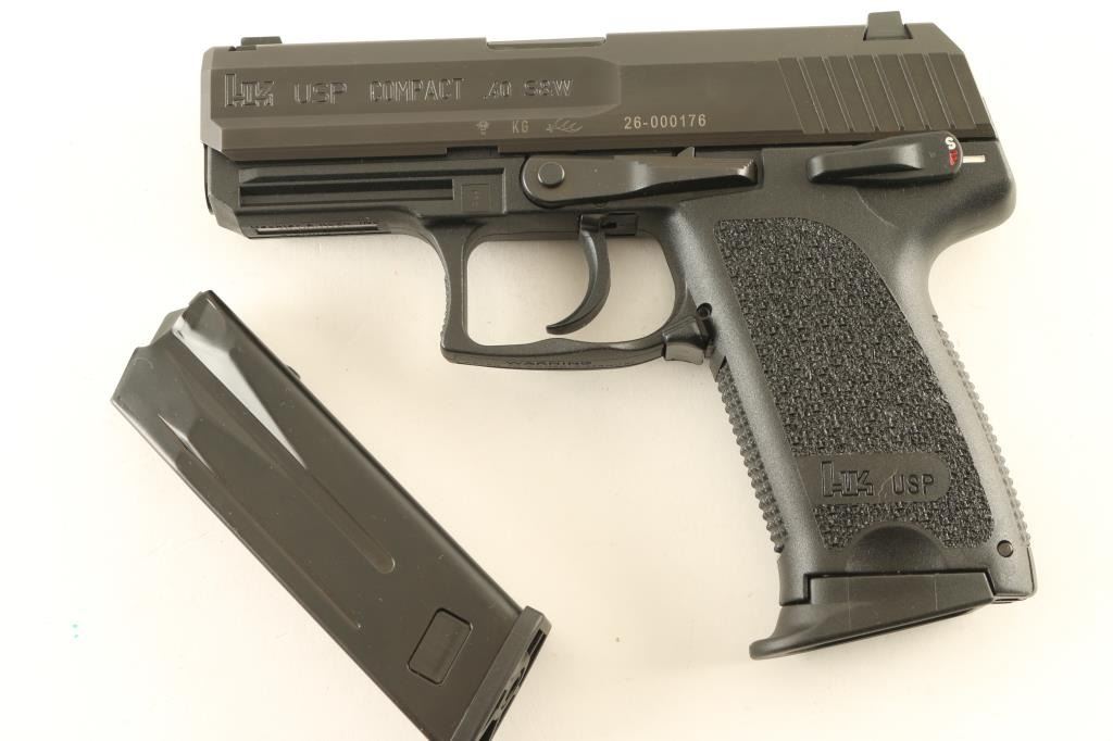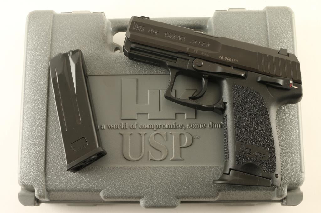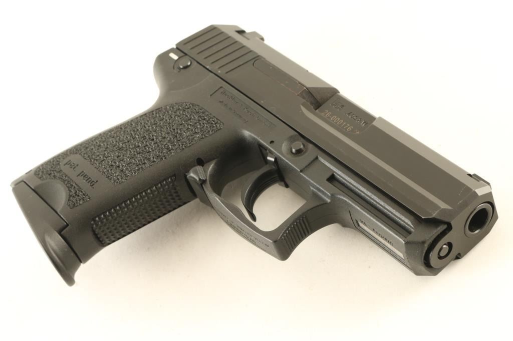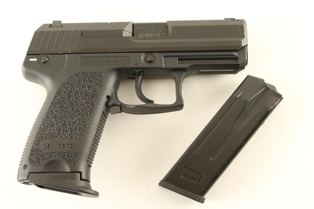 SN: 26-000176 German semiautomatic pistol imported by Heckler & Koch Inc, Sterling VA . Features dovetail mounted 3 dot sights, 3.5" barrel, double/single action, frame mounted safety/decocker, black polymer frame with accessory rail, black steel slide, lanyard attachment point at butt. Bore is in excellent condition. Overall condition is like new with minor handling marks. Includes (2) magazines, manual, HK hard plastic carry case. Condition is NRA Excellent - like new *** Modern Firearm ***