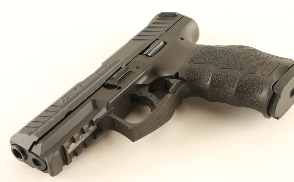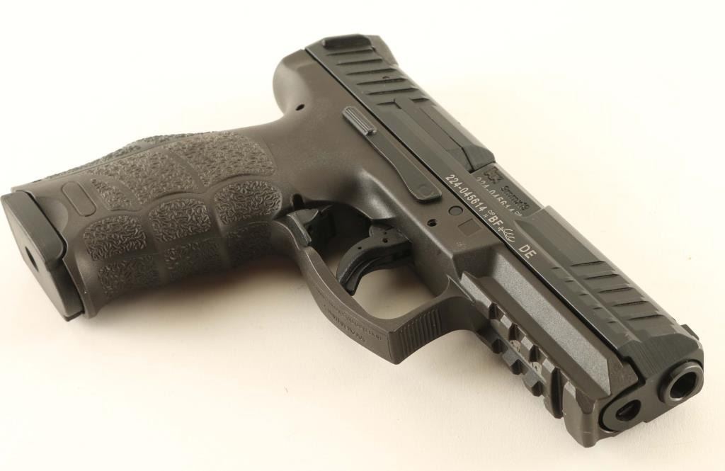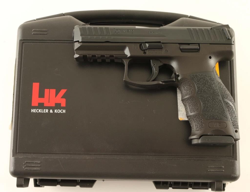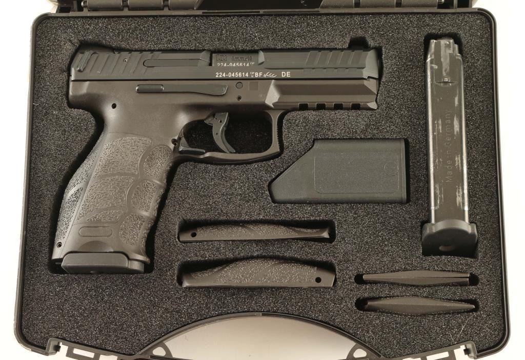 'Variant 1' High quality striker-fired semi-automatic pistol chambered in 9x19mm, manufactured in Germany circa 2015. Configuration: black Hostile Environment nitride finished slide featuring fore & aft cocking serrations & rear charging supports, cold hammer forged 4.09" cannon grade steel barrel with polygonal rifling, dovetailed luminescent three-dot sights, low-profile ambidextrous slide release, trigger safety, cocked indicator, loaded chamber indicator, ambidextrous paddle style magazine release, factory 15 round magazine, and reinforced black polyamide frame with integral accessory rail, lanyard loop & interchangeable backstrap/lateral plates. Includes the original factory hard case with manual, spent case, lock, spare magazine, speed loader, 2 additional backstraps and 4 additional lateral plates. Pistol retains approximately 98%+ of its original finish showing some slide wear on the barrel with no other wear observed. Action is crisp, the bore is pristine and the polymer is fine. Condition is NRA Excellent in case. ***Modern Firearm***