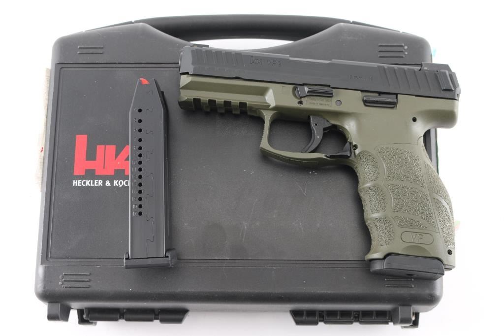 German semiautomatic pistol imported by HKI, Columbus GA. Features 4.1" barrel, three dot night sights in dovetails, striker fired with striker status indication, manual safety in trigger, accessory rail on dust cover, changeable grip panels and backstrap. Finish is black slide over dark forest green polymer frame. Bore is excellent condition. Overall external condition is like new, with little evidence of handling. Night sights retain their glow. Serial numbers match on frame, slide, barrel. Includes factory plastic case, manual, two additional backstraps, additional sets of grip panels, spare magazine, mag loader.
