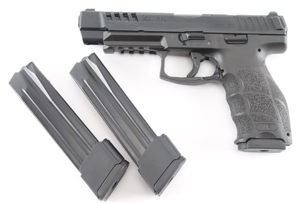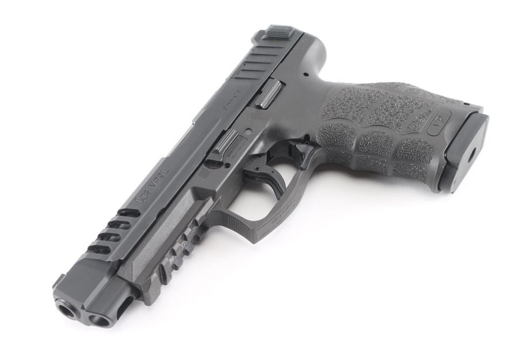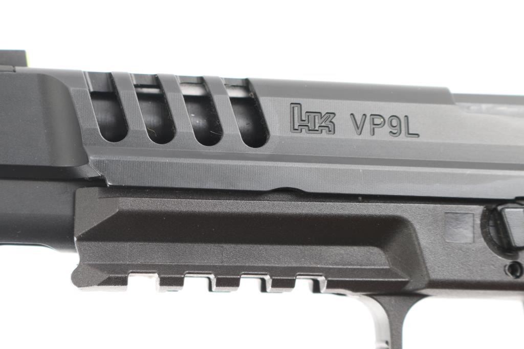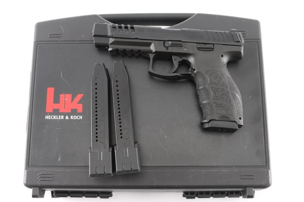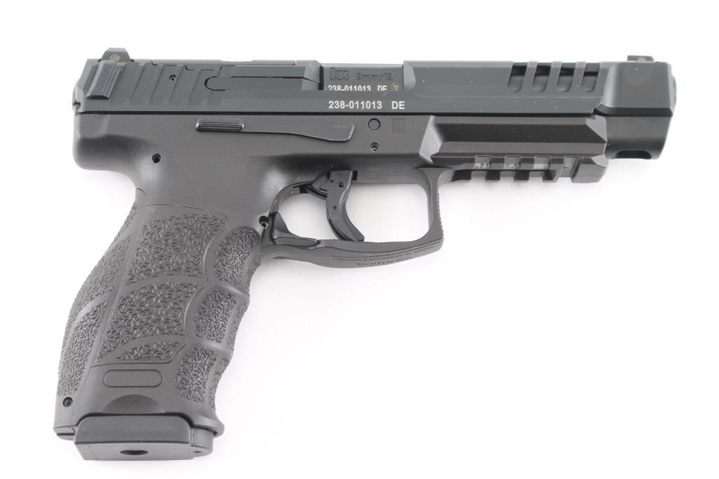 Optics Ready German semiautomatic target or competition pistol imported by HKI, Columbus GA. Features longer 5" barrel, lengthened slide with lightening cuts, sights in dovetails (XS green dot sight in front, plain window rear sight), striker fired with striker status indication, manual safety in trigger, accessory rail on dust cover, changeable grip panels and backstrap. Finish is black slide over black polymer frame. Slide has removable panel forward of rear sight, for mounting a red dot reflex sight. Bore is excellent condition. Overall external condition is like new, with little evidence of handling. Serial numbers match on frame, slide, barrel. Includes factory plastic case, manual, two additional backstraps, additional sets of grip panels, 2 spare extended (20 rd) magazines, mag loader.