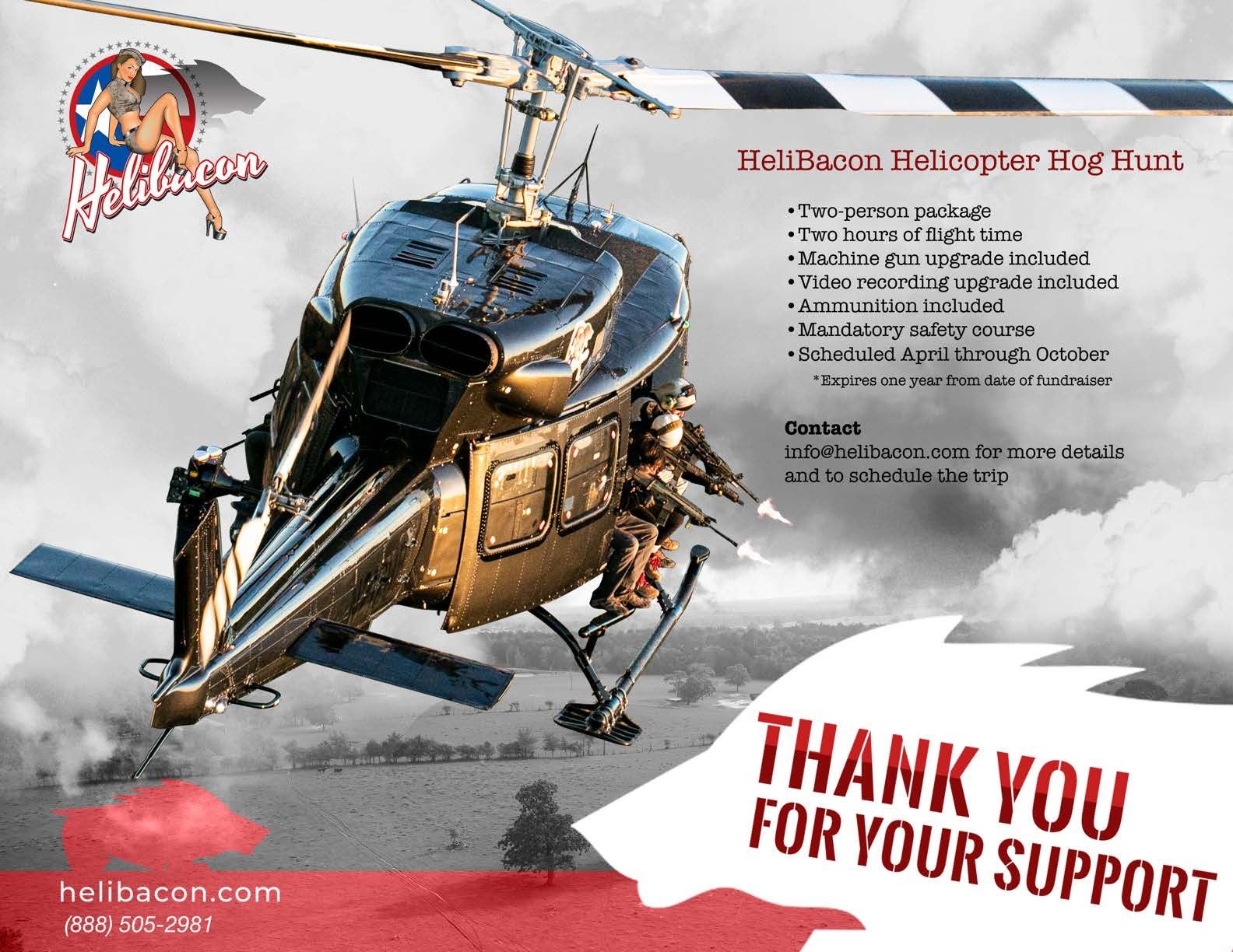 The HeliBacon Helicopter Hog Hunt package is a two-person, two-hour hunt included is Machine Gun upgrade w/ ammunition.