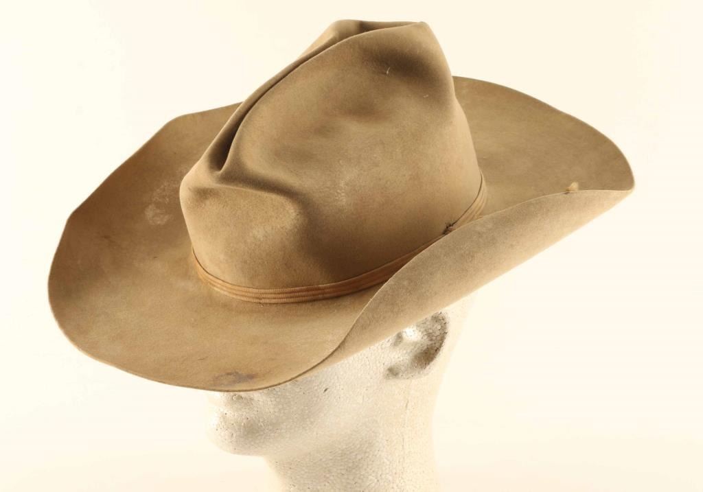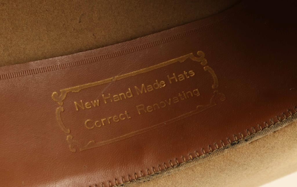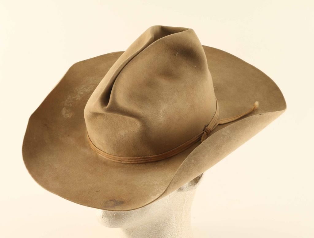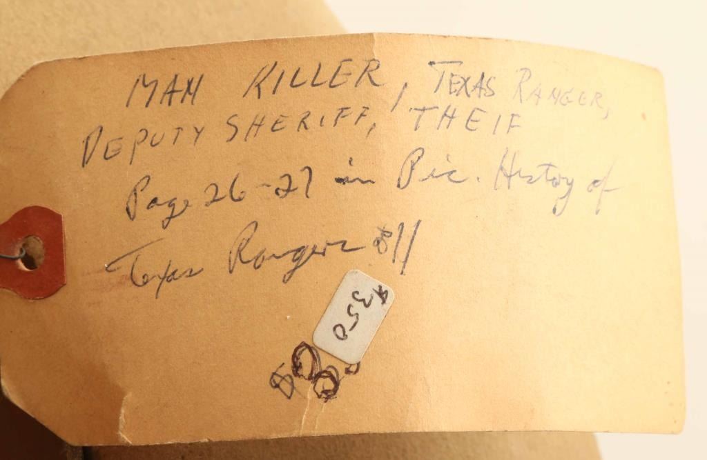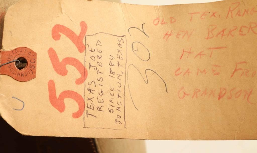 Tag reads "Old Texas Ranger Hen Baker's hat, from grandson" and "Texas Joe Registered since 1884 Junction, Texas". Shows age.