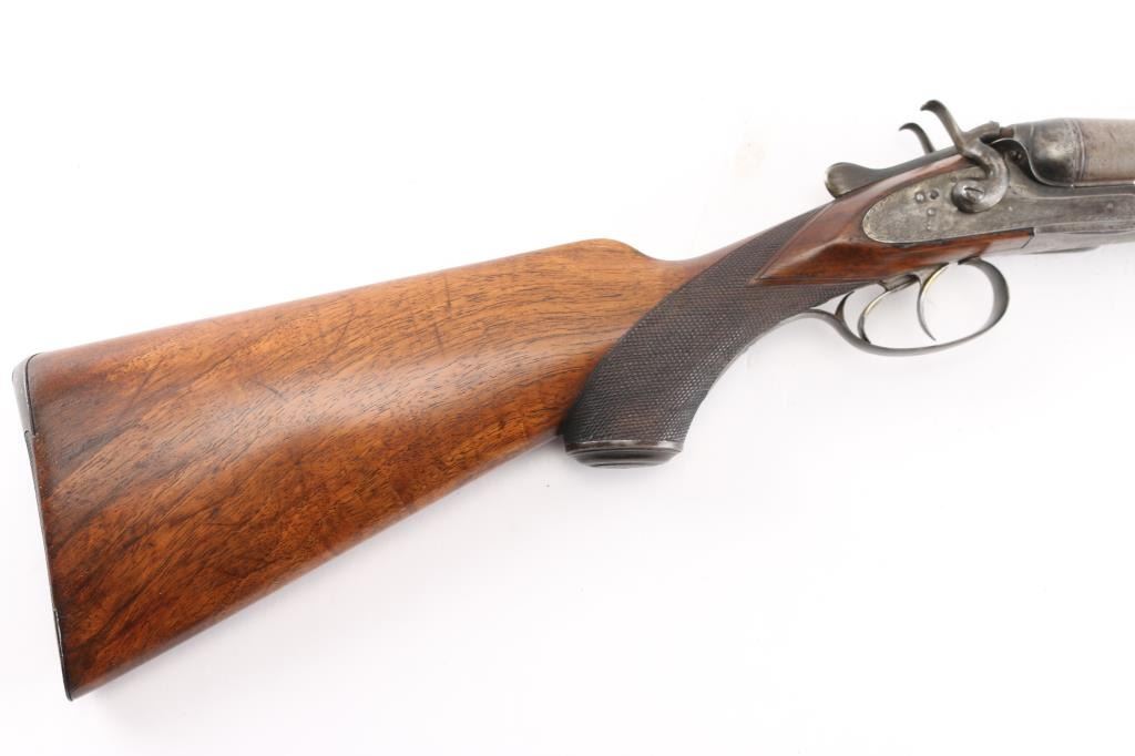 Exposed hammer double barrel sidelock shotgun. The concave sighting rib is engraved & inlaid "HENRI ECKHARDT SAC CAL". The underside of the barrels are marked "DAM-R", SUHL" & "SAUER". 30-1/2" BBLs that are silver banded. Great pattern and most light satin gray finish. Actions show light engraving w/ silver band and traces of case-hardening. Skeleton butt w/ checkered center panel. stocks are nicely checkered select walnut. 13-7/8" from front trigger to butt, 4-1/4" drop at butt and 2-5/8" at the comb. Bore is shiny and locks up tight. Engraved steel pistol grip cap and trigger guard. Thick walls on BBL (chamber 2-3/4") and choked about full both BBLs. Probably a "duck gun". Larry Shelton California collector, author estate. Mr. Shelton, in his book California Gunsmiths, describes him as “ ..a highly respected gunsmith… making guns for the most skilled marksmen and the experienced hunter.”