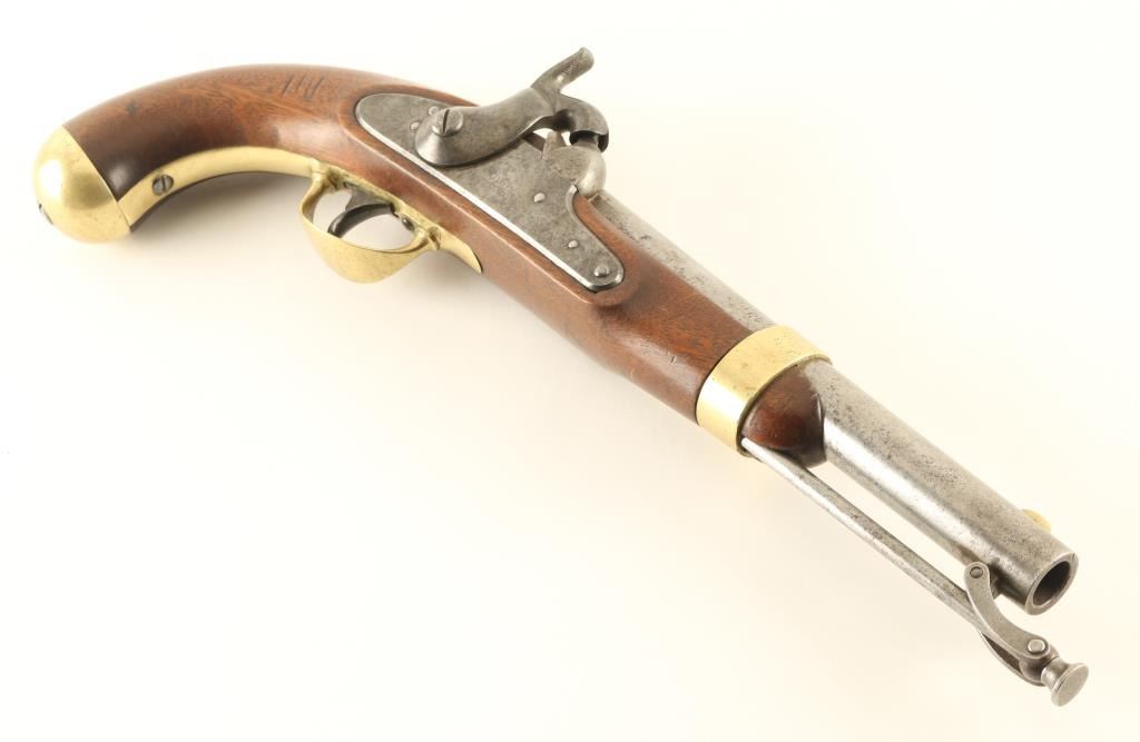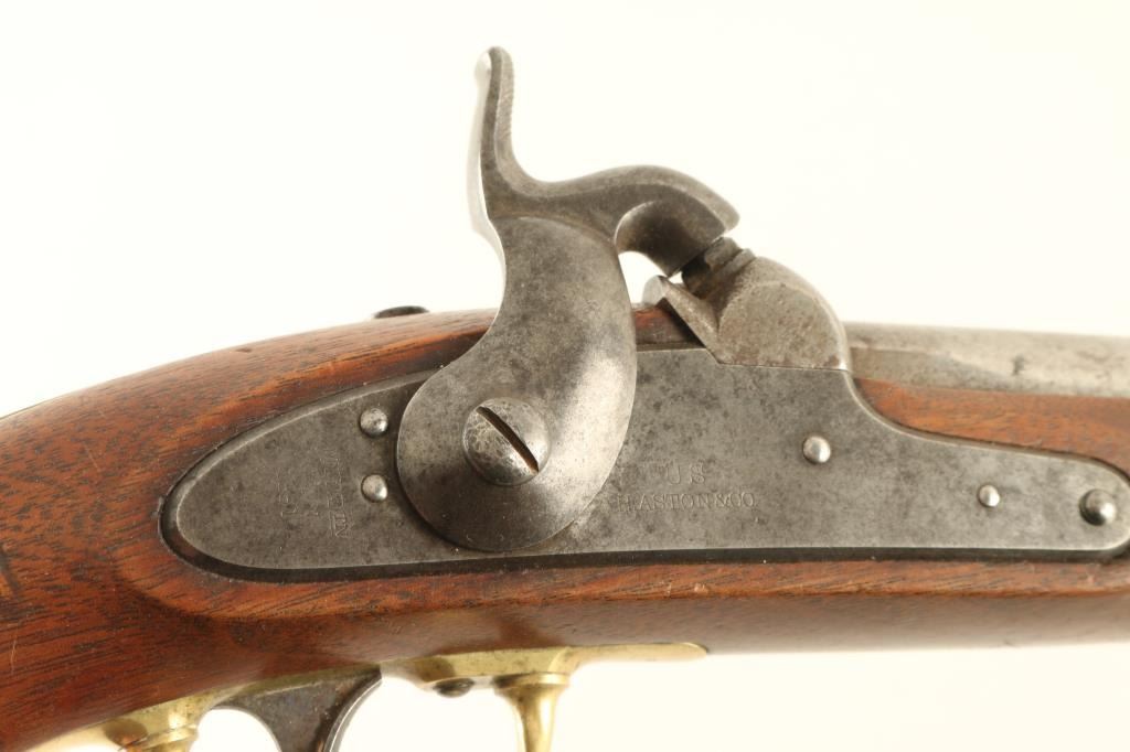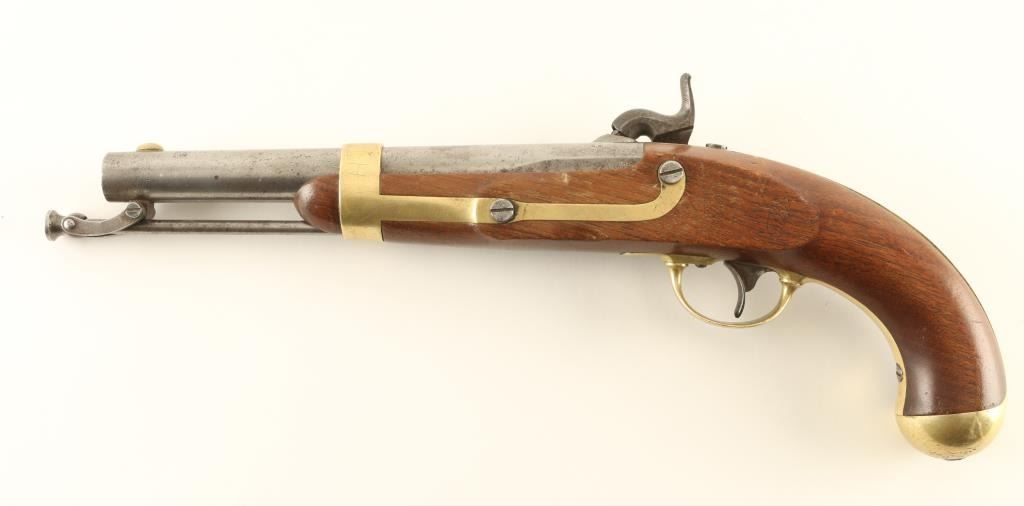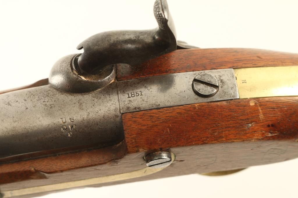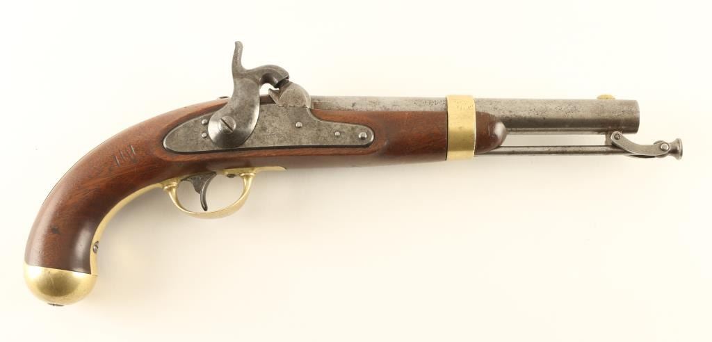 US military pistol features percussion side lock, 8.5" barrel with brass front sight, no rear sight, hinged ramrod under barrel, brass combination barrel band / serpentine, brass reinforcement at butt. Bore is smooth, brown colored with even solid patina and light rust, slightly scaly appearance. Barrel is mostly bare metal, some thin brown or gray coloration present, overall smooth surfaced, many small areas of slight pinprick pits. Lock has a thin but even gray or brown patina color, small pits especially around nipple and bolster. Trigger has light rust on back & sides. Brass pieces appear cleaned, smooth with yellow color, many small dents on butt cap. Screw slots are generally good with little evidence of marring. Stock is very good condition, good fit to metal with slight shrinkage at back strap and slight gap around lock, many small dents and scratches, four narrow notches cut or filed into right wrist. Lock operates smoothly and ramrod hinge is functional. Markings include "US / GW / P" at barrel breech, "1851" on plug tang, "US / H. ASTON & CO" and "MIDDTN / CONN / 1851" on lock plate. Condition is NRA Very Good *** Antique Firearm ***