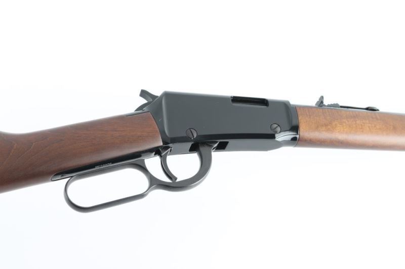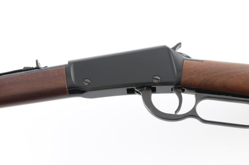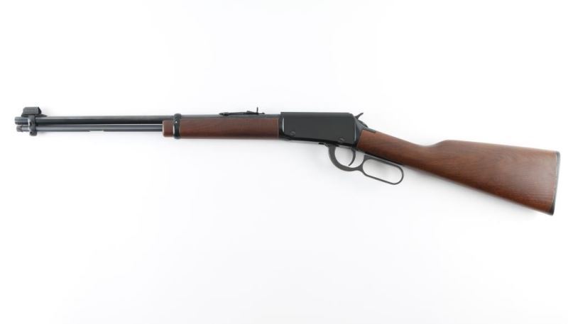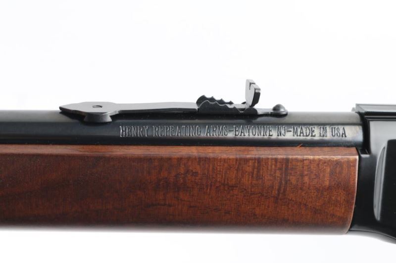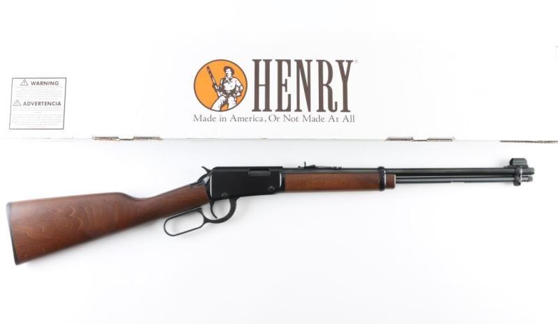 Rifle. Lever-Action. American made by Henry. Barrel address is Bayonne, N.J. 18.5" round barrel with hooded blade front, and adjustable u-notch rear sights. Smooth walnut stock/forearm. Black plastic buttplate. Full length magazine. (15 LR) 1/4 cock safety. Blue finish with black, optics grooved receiver. Serrated trigger. Bore appears excellent/bright. Action is smooth/tight. Metal/wood are excellent. Rifle appears in almost new condition. Comes in original factory box with matching serial number. NRA Condition-Excellent. Modern Firearm.