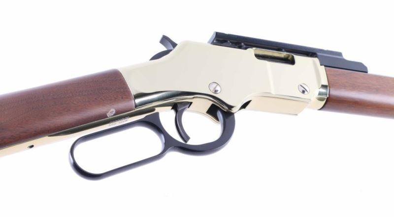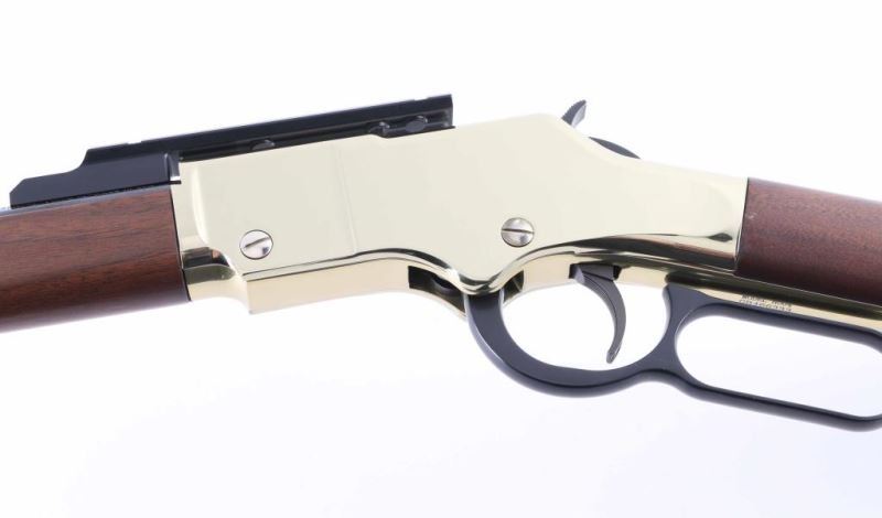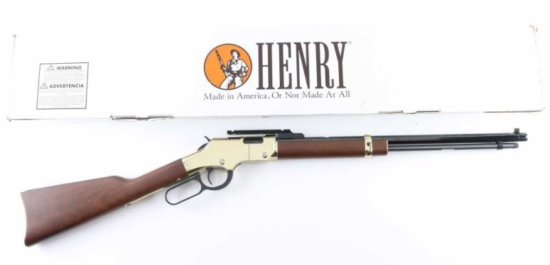 'Golden Boy' American made lever action repeating rifle chambered for .22 Short, Long or Long Rifle. Features a 20" octagonal barrel with high luster blued finish, full-length 16 round tube magazine, dovetailed blade front sight with brass bead, removed rear sight, installed Henry cantilever style optics rail, serrated trigger, serrated hammer spur, bright Brasslite finished receiver, smooth American walnut forend with brass band and straight grip shoulder stock with brass carbine buttplate. Includes the original factory cardboard box. Rifle retains approximately 97% of its original finish showing a couple small losses on the lower tang, a bright scratch on the top of the barrel and some scattered handling marks. Action is smooth, the bore is pristine and the wood stocks are near fine with dents & dings. Condition is NRA Very Good. ***Modern Firearm***