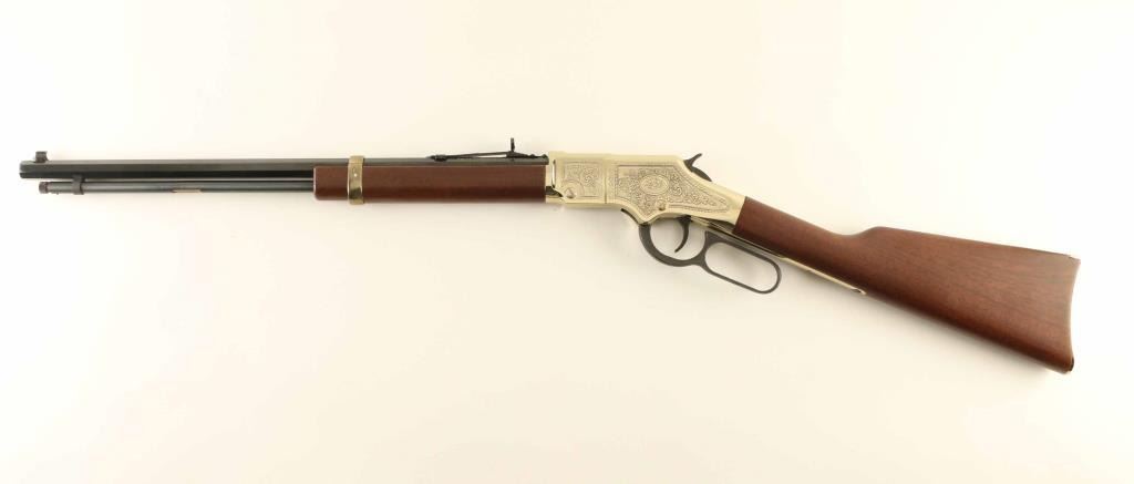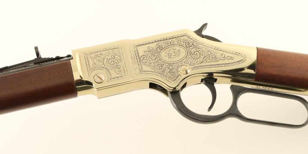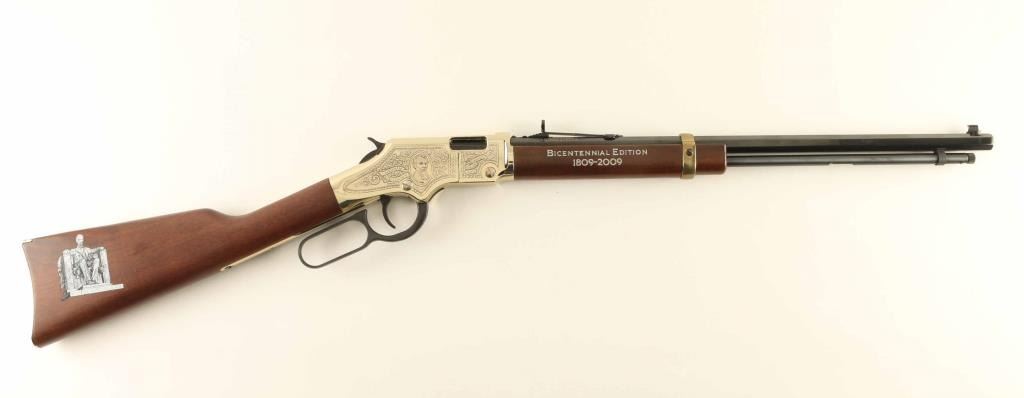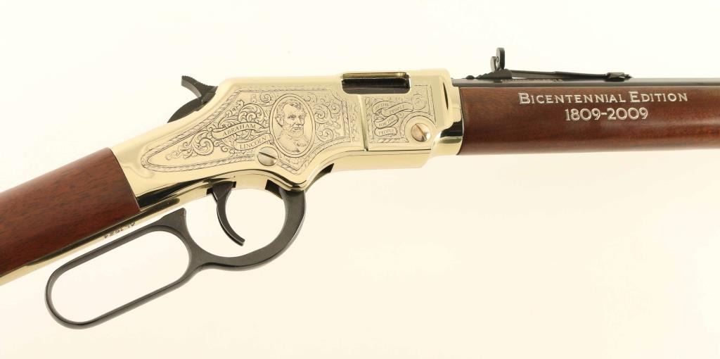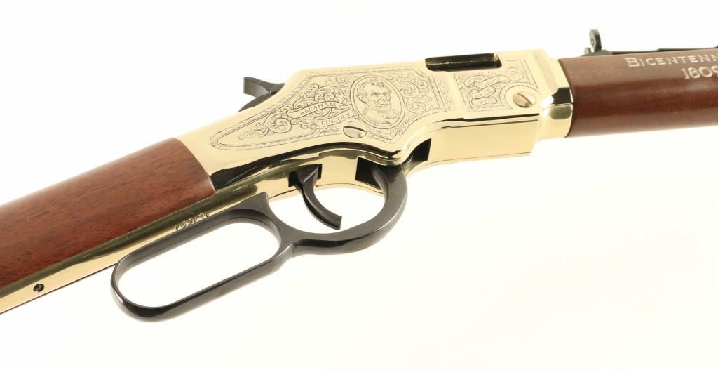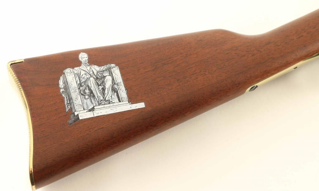 .22 S/L/LR SN: AL1624 Commemorative lever action rimfire rifle features 20" octagonal barrel, buckhorn sights, full length magazine tube, gold colored receiver cover & buttplate & barrel band, blued finish on other metal parts, plain walnut stock & forend. Sides of receiver are engraved with floral scrolls, and likeness of Abraham Lincoln on right side. Right side of forend is engraved and white paint filled "BICENTENNIAL EDITION / 1809 - 2009". Right side of butt features a black & white image of the Abraham Lincoln statue from the Lincoln Memorial. Overall condition is like new with few signs of handling. Condition is NRA Excellent - like new *** Modern Firearm ***