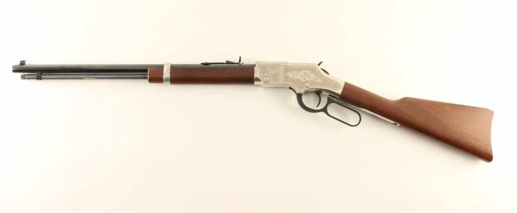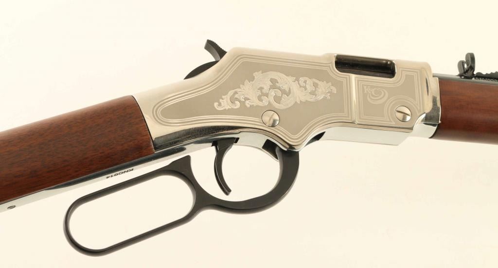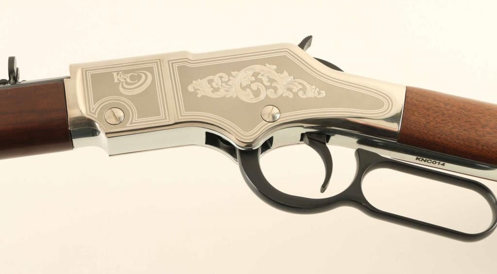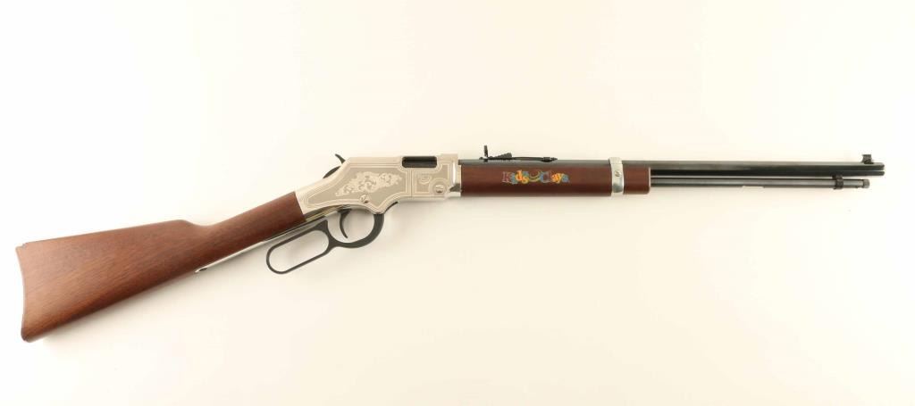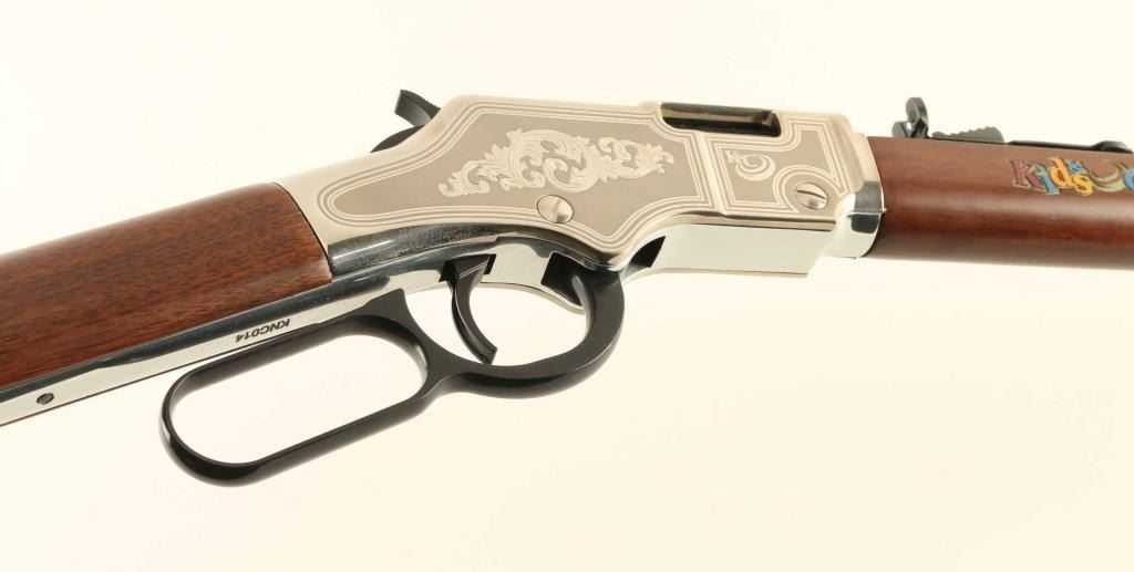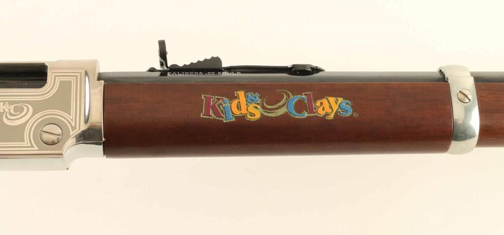 Commemorative lever action rimfire rifle features 20" octagonal barrel, buckhorn sights, full length magazine tube, nickel finished receiver cover & buttplate, plain finished bright metal barrel band, blued finish on other metal parts, plain walnut stock & forend. Sides of receiver are engraved with a large floral scroll, bright polished border lines, "K&C" logo. Right side of forend is engraved and brightly painted with "Kids & Clays" label. Overall condition is like new with few signs of handling. Condition is NRA Excellent - like new *** Modern Firearm ***