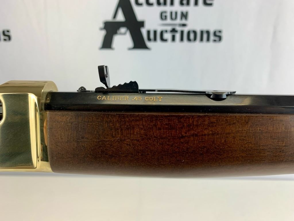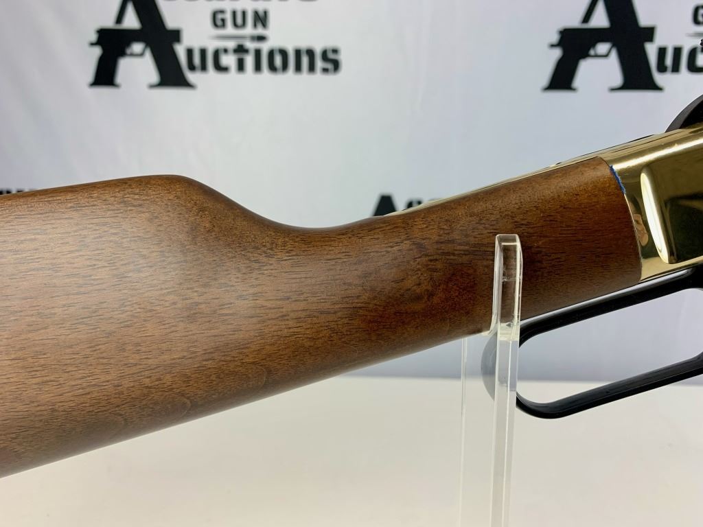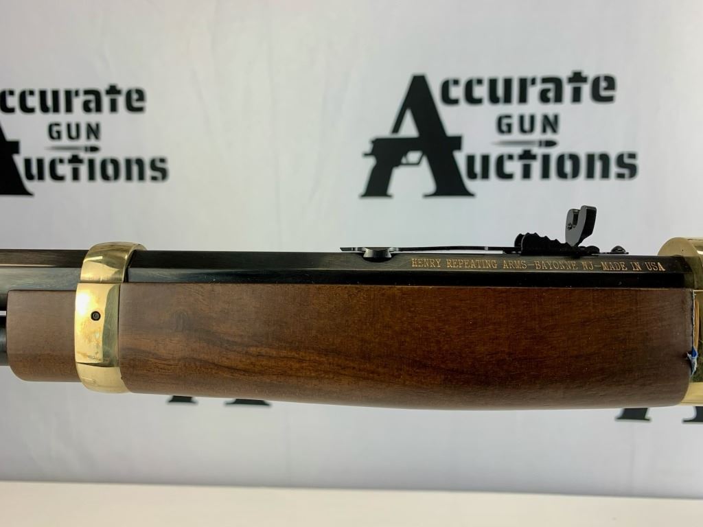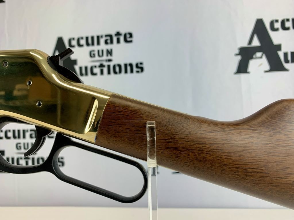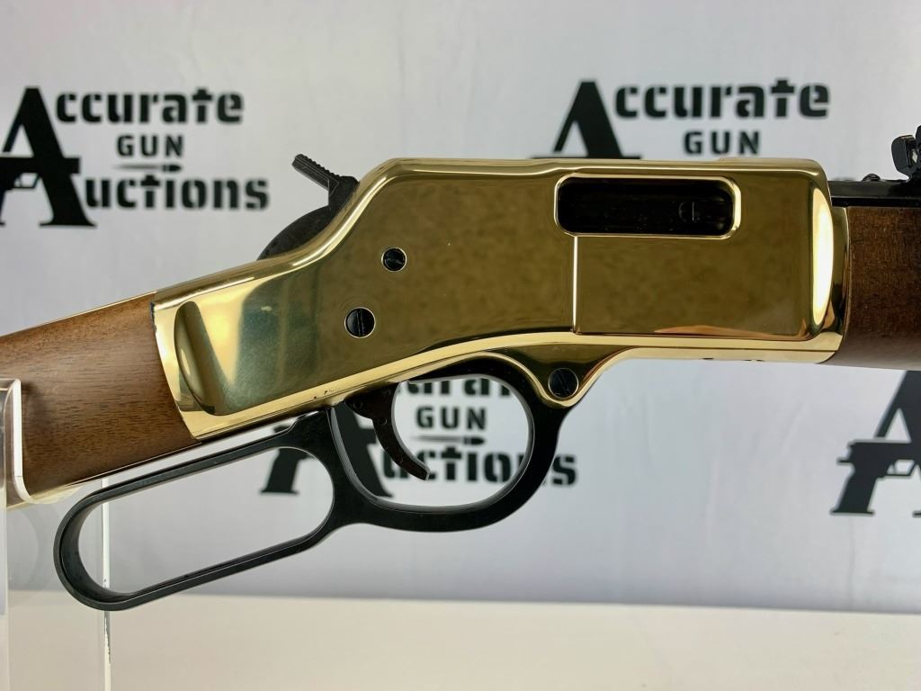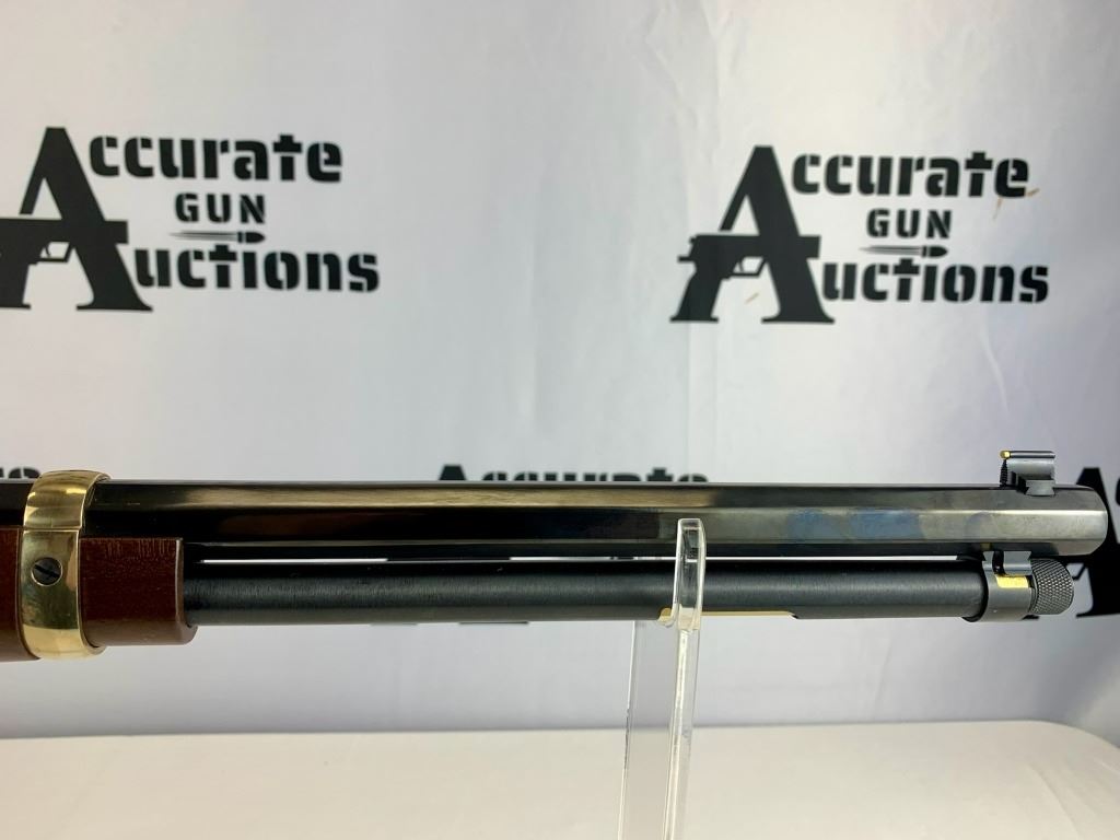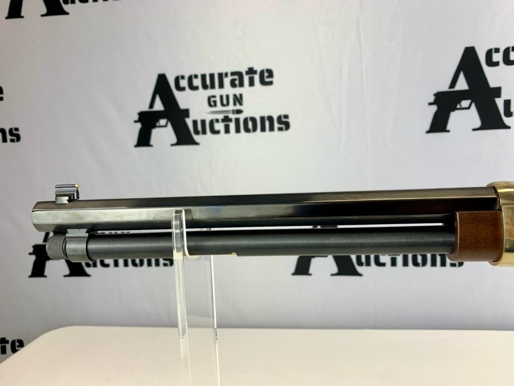 With an overall length of 38", this gold-plated Henry comes with the original box and papers, adjustable rear sight, static front sight, gold-plated metal buttplate, and the wooden furniture is in perfect