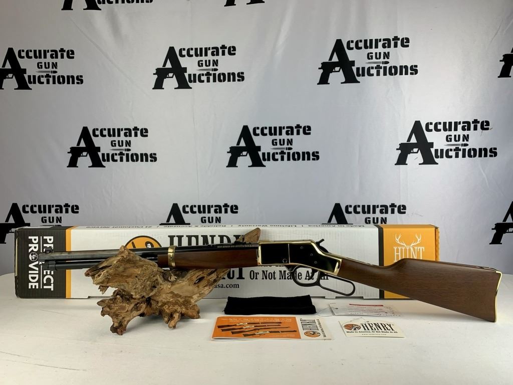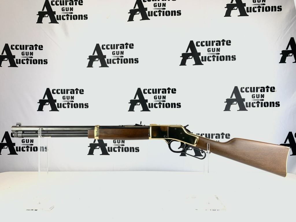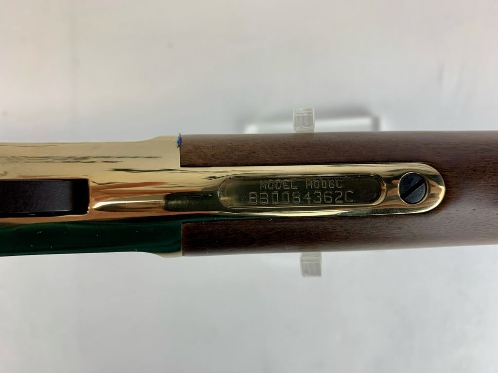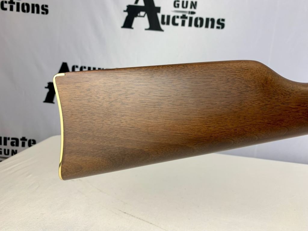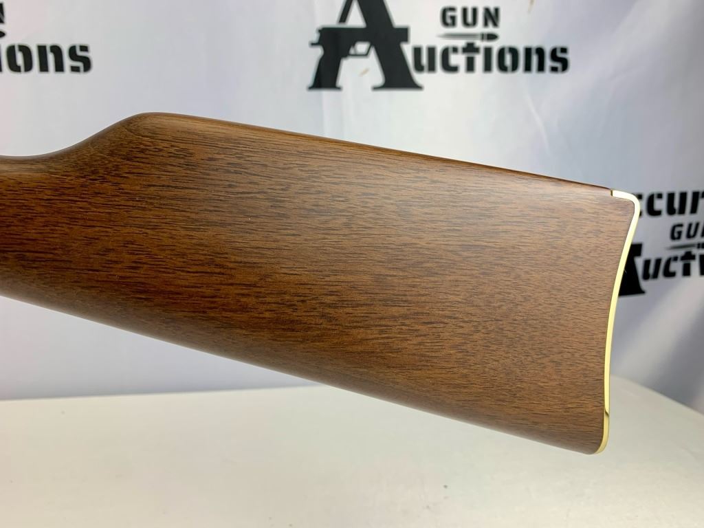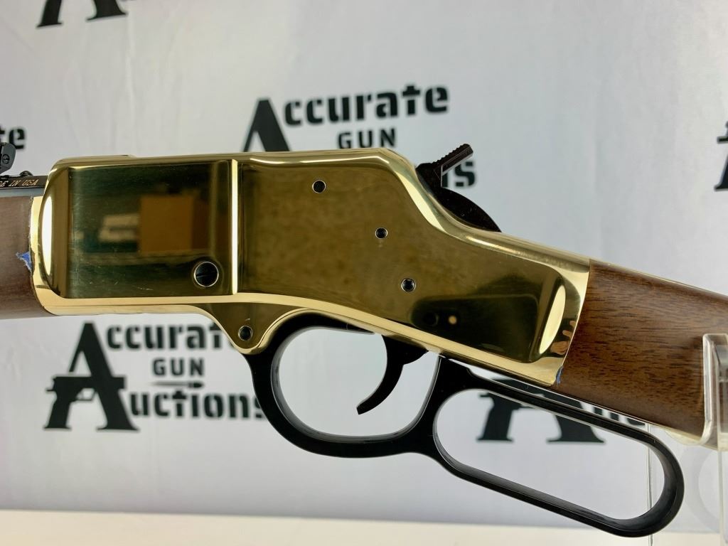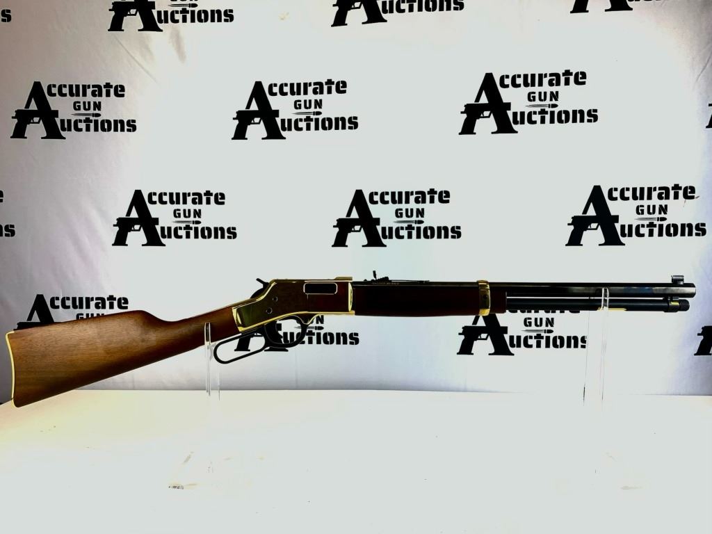 With an overall length of 38", this gold-plated Henry comes with the original box and papers, adjustable rear sight, static front sight, gold-plated metal buttplate, and the wooden furniture is in perfect