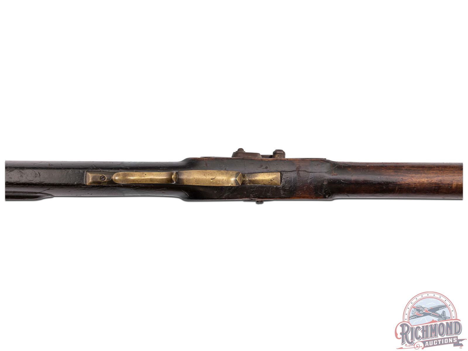 Barrel is turning to a smooth plum patina with pitting near breech. Lock has dark surface with pitting. Wood has traces of original dark finish with usage marks. Toe has old missing tip with butt plate bent to cover missing area. Usual burnout around lock. Brass has golden patina finish and is unpolished. Dark pitted bore with visible rifling. Action is sticky with slow function. Honest out of the attic rifle.