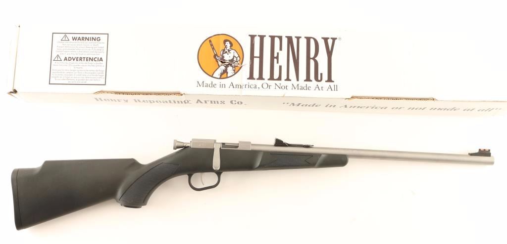 American made stainless steel bolt action single shot boys rifle chambered in .22 Long Rifle. Features a satin finish, fiber optic blade front sight, adjustable fiber optic rear window sight, butter-knife style bolt handle, knurled manual cocking piece, smooth trigger with scalloped edges, manual safety and checkered black synthetic pistol grip shoulder stock with beavertail forend & high comb. Includes the original factory cardboard box with documents. Rifle exhibits little wear with what looks to be a few freckles of emerging surface rust on the barrel ahead of the forend. Action performs well, bore is very good and synthetic stock is fine. Condition is near excellent. ***Modern Firearm***