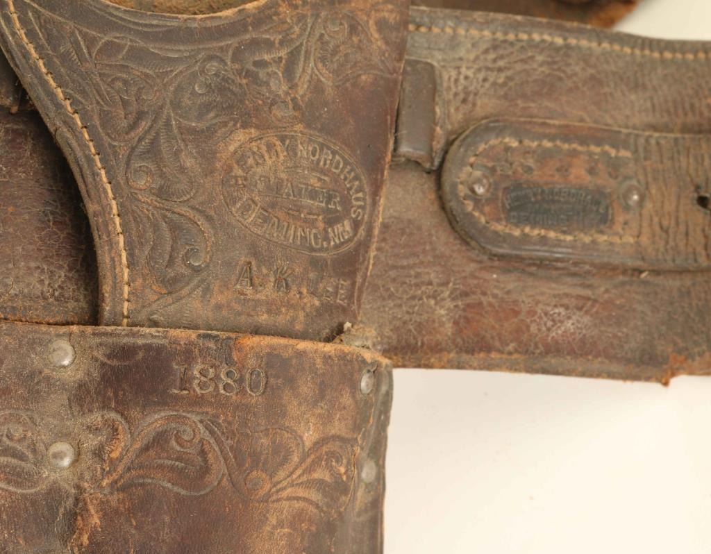 Extra wide brown leather money belt maker marked twice once in the leather second on metal plaque. Holster is tooled maker marked Henry Nordhaus maker Deming NM A.K. LEE 1880. shows age and use. Measures 40" from end to end