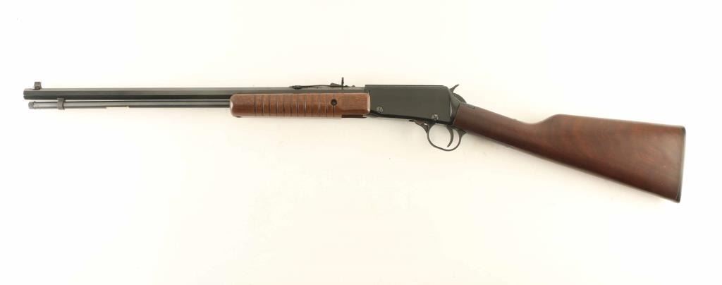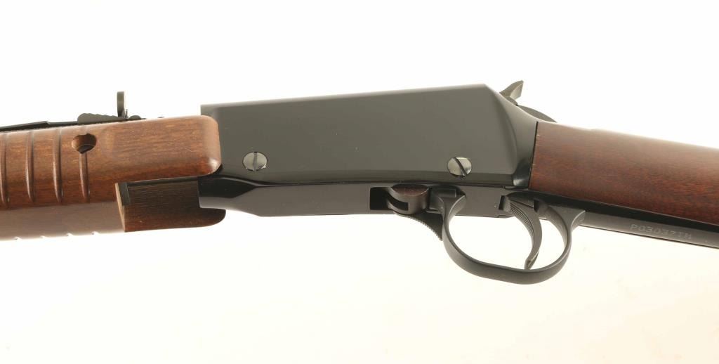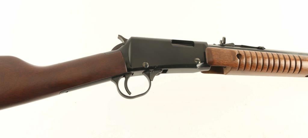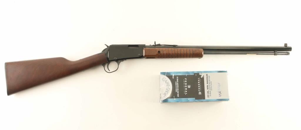 SN: P03037TM Pump action rimfire rifle features blued finish, plain wood stock & forend, 20" octagonal barrel with full length magazine tube underneath, buckhorn style sights. Bore is excellent. Overall external condition is very good to excellent, with few light scuff marks on receiver cover at scope rail and bottom edge. Includes fair condition original factory box and a complete carton of 500 rounds of Federal brand 22 Magnum JHP ammo in 50 round plastic boxes. Condition is NRA Excellent *** Modern Firearm ***