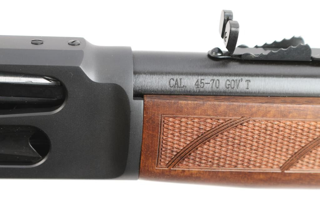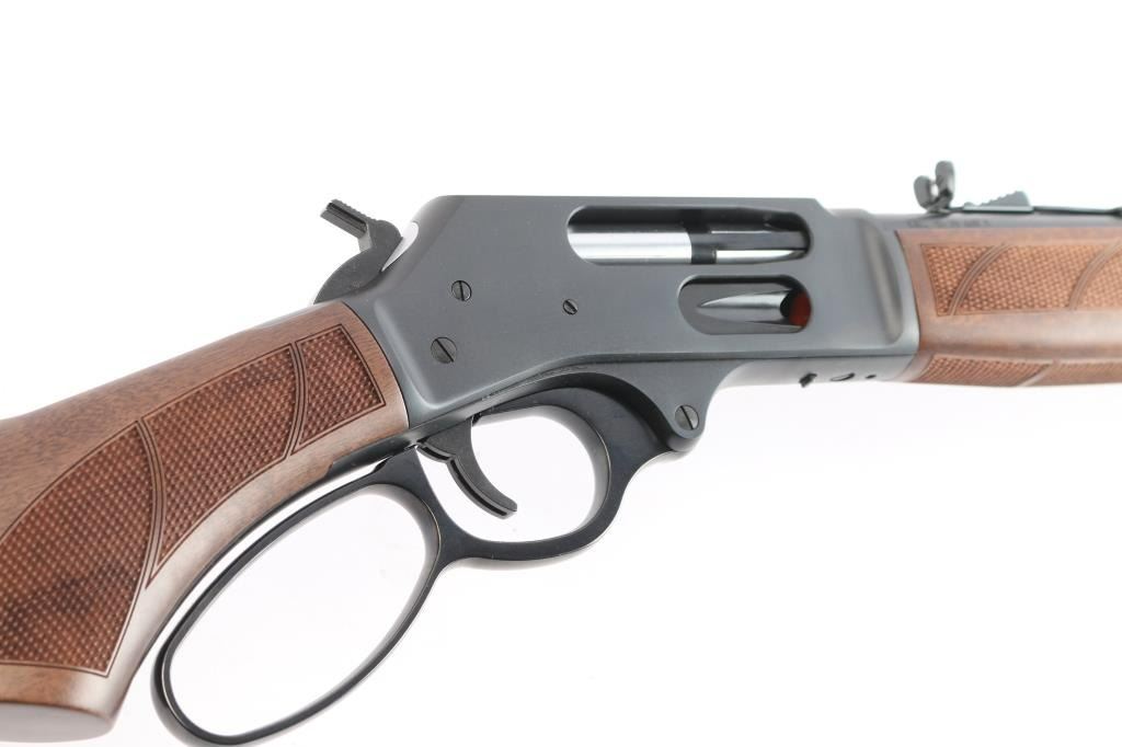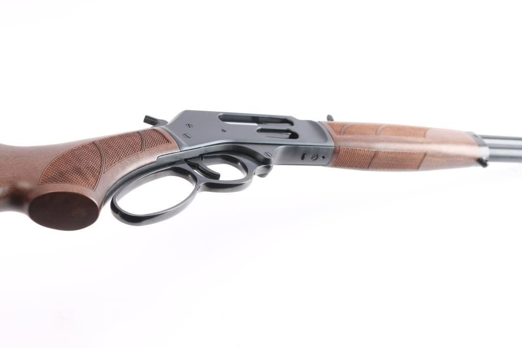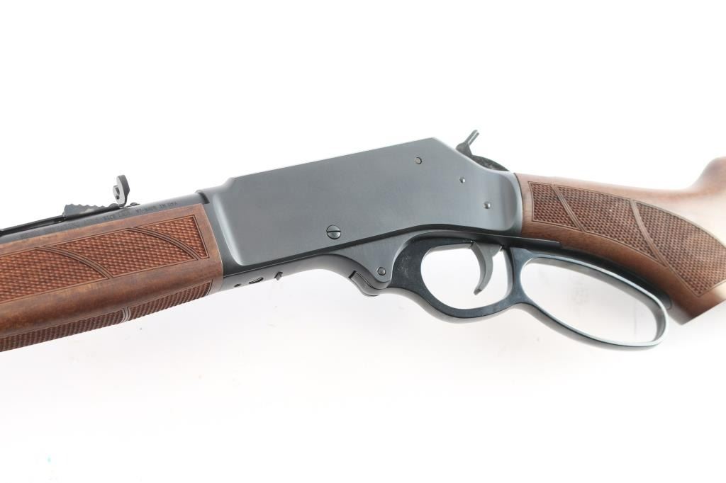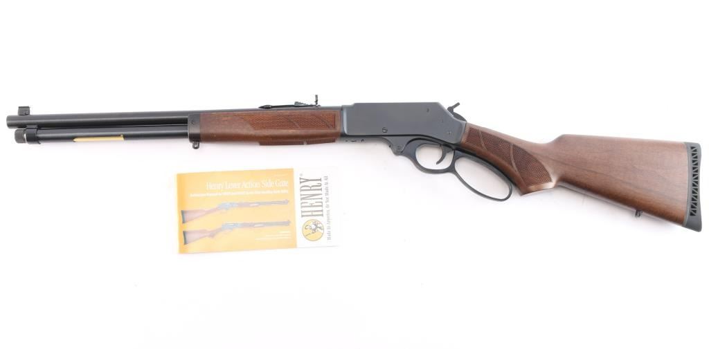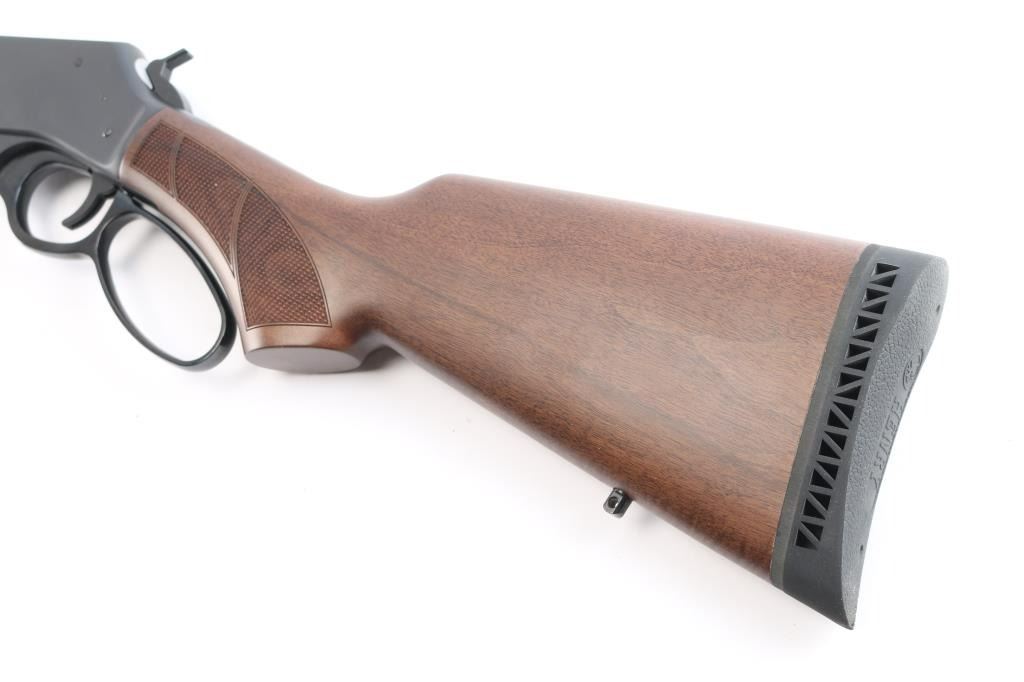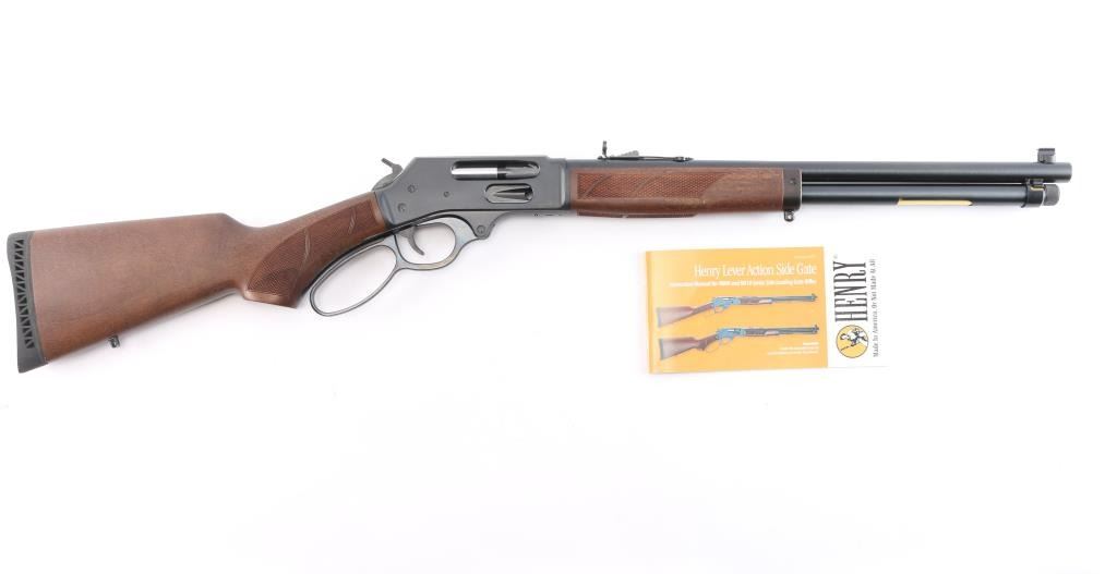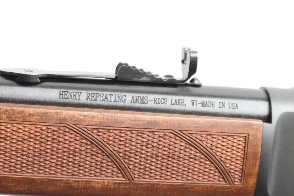 #WFFS20378G. Lever-Action rifle. "Big Boy Steel" American made by Henry. Barrel address is Rice Lake WI. 18.43" round barrel with post/brass bead front, and adjustable semi-buckhorn rear sights. Checkered walnut stock/forearm. Black rubber vented factory buttplate. Full length magazine. (4 rds) Transfer bar safety. Blue finish with matte-black receiver, drilled/tapped for optics. Smooth trigger. Sling swivel studs. Bore is excellent/bright. Action is smooth/tight. Metal/wood are excellent. Rifle appears in almost new condition. Comes with manual.