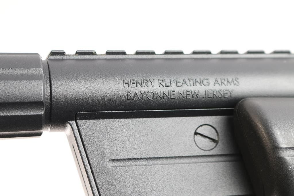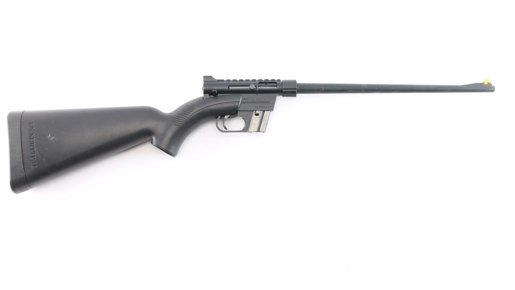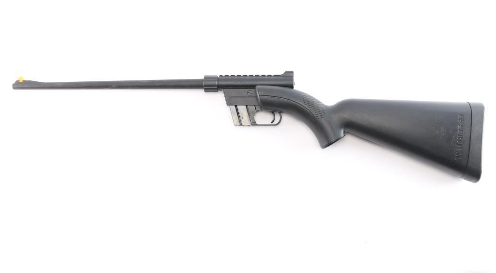 #US036220B. Semiautomatic rimfire rifle chambered for 22LR. Rifle is a close copy of the AR-7 survival rifle designed by Eugene Stoner, and disassembles into smaller components that can be stored inside the hollow floating buttstock. Features 16" barrel with plastic orange front sight, rear peep sight, integral scope rail, manual thumb safety, detachable 10-rd magazine, black plastic butt. Overall condition is like new. Bore is excellent/bright